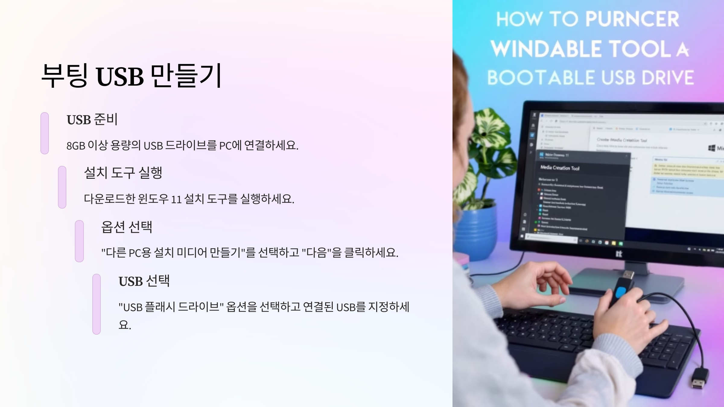 윈도우 11을 새로 설치하려면 부팅 가능한 USB가 필요해요. 마이크로소프트의 설치 도구를 이용하면 쉽게 만들 수 있어요.