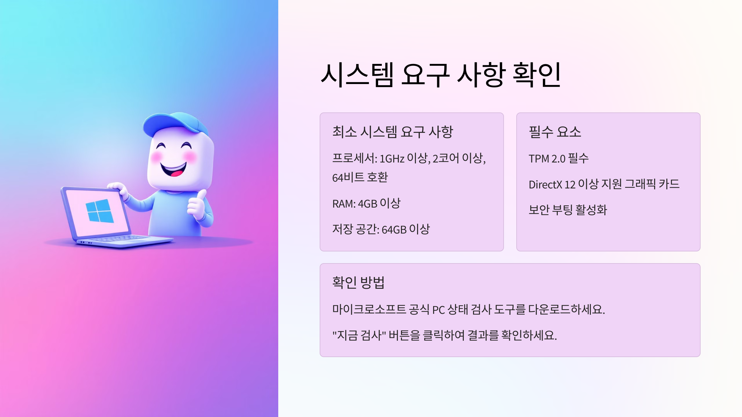 윈도우 11을 설치하려면 먼저 PC가 최소 시스템 요구 사항을 충족하는지 확인해야 해요. 특히 TPM 2.0과 보안 부팅이 활성화되어 있어야 해요.