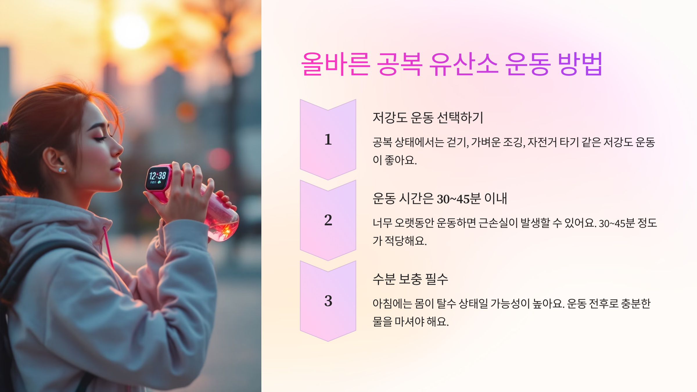 공복 유산소 운동을 효과적으로 하려면 몇 가지 중요한 원칙을 지켜야 해요. 무턱대고 강한 운동을 하면 오히려 부작용이 생길 수 있거든요. 안전하고 효과적인 방법을 알아볼까요? 🏃‍♂️