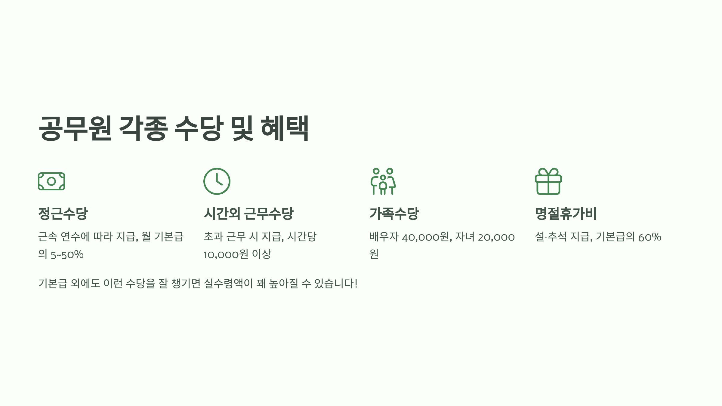 공무원 봉급은 기본급뿐만 아니라 다양한 수당이 함께 지급돼요. 특히 직급과 직무에 따라 추가로 받을 수 있는 수당이 많아요! 💰