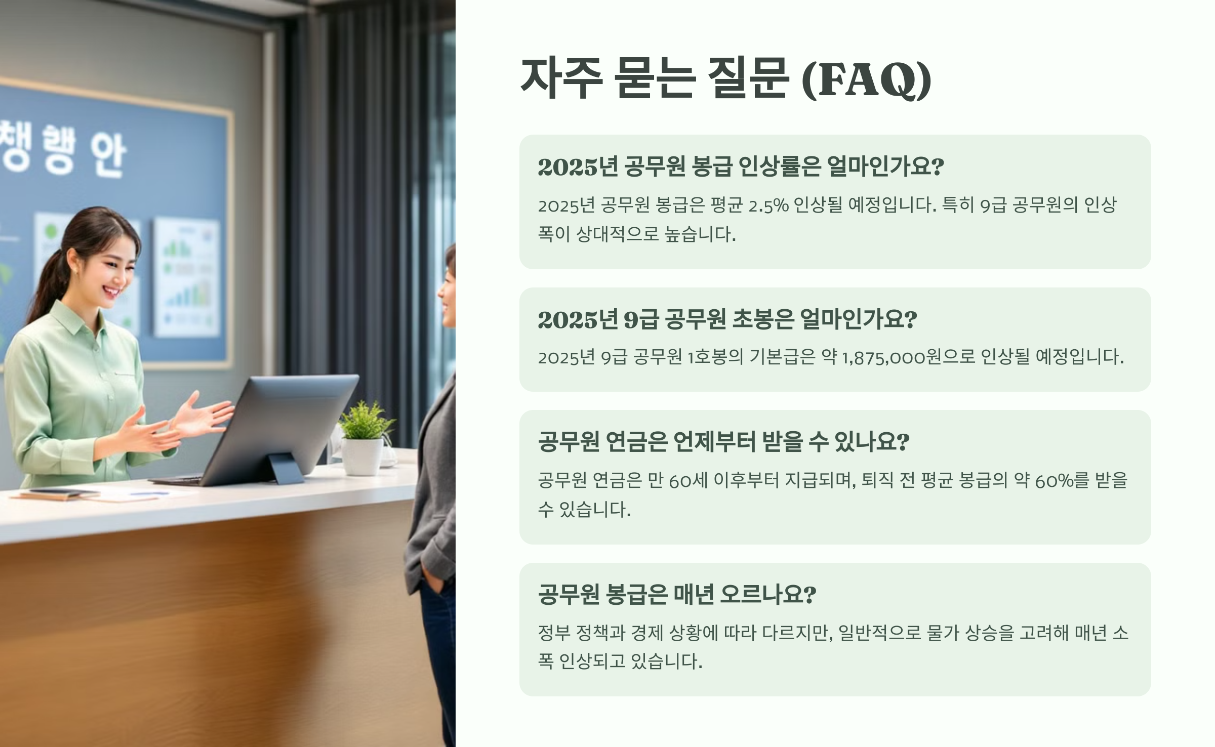 A1. 2025년 공무원 봉급은 평균 2.5% 인상될 예정이에요. 특히 9급 공무원의 인상폭이 상대적으로 높아요.
