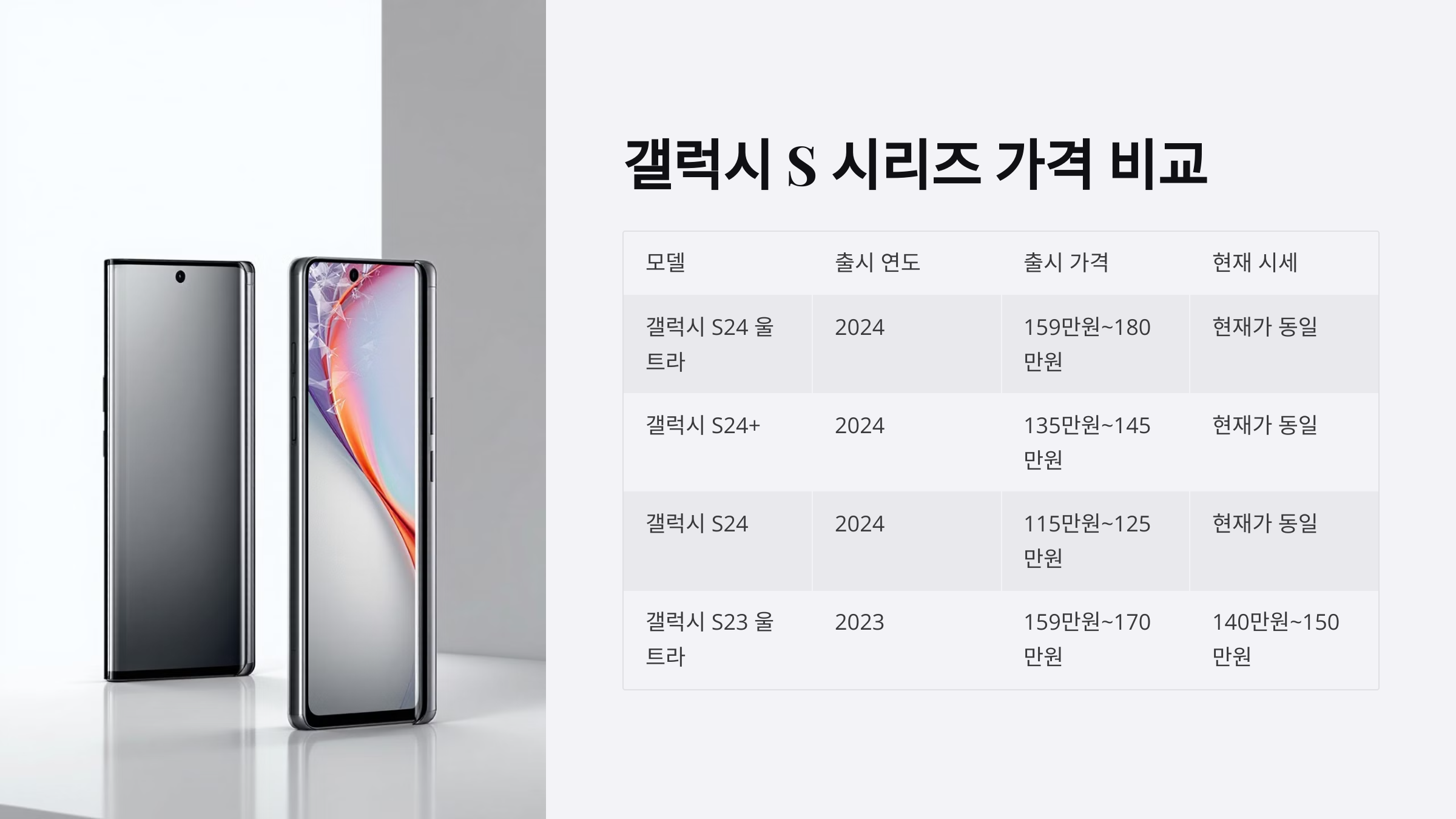 갤럭시 S 시리즈는 삼성의 대표적인 플래그십 스마트폰 라인업이에요. 강력한 성능과 프리미엄 디자인, 뛰어난 카메라 성능으로 유명하죠. 2024년 기준으로 출시된 최신 모델과 그 이전 모델들의 가격을 비교해볼게요.