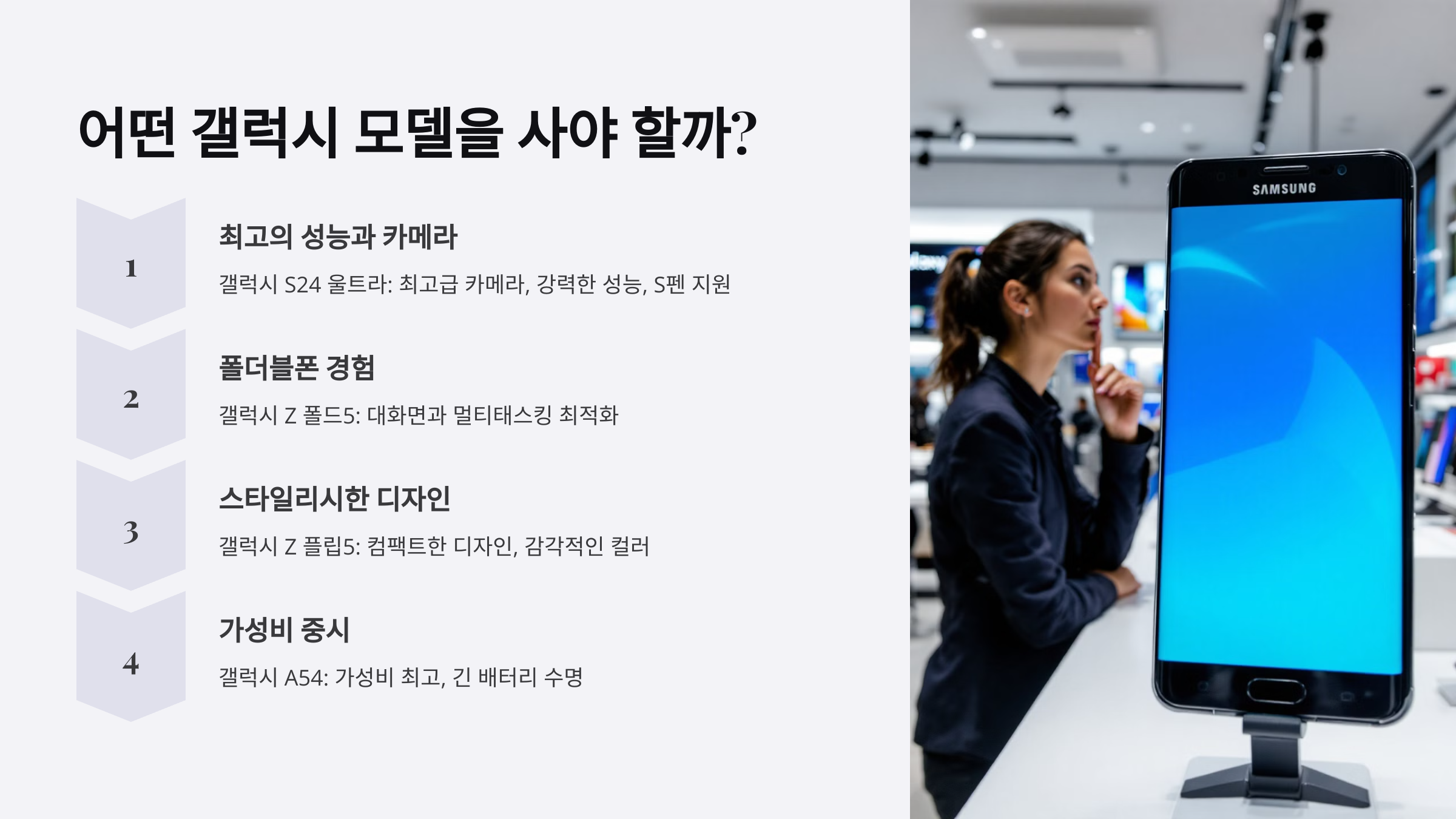 갤럭시 스마트폰은 내 예산과 사용 목적에 따라 선택하는 것이 가장 중요해요. 프리미엄 성능이 필요하면 S 시리즈, 혁신적인 디자인을 원하면 Z 시리즈, 가성비를 따진다면 A 시리즈가 좋아요! 📱