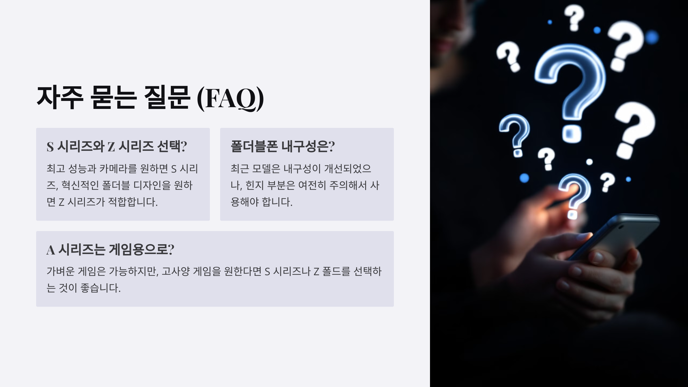 이제 갤럭시 모델을 선택하는 데 도움이 되었나요? 😊 추가적으로 궁금한 점은 FAQ에서 확인해볼까요? 🔍
