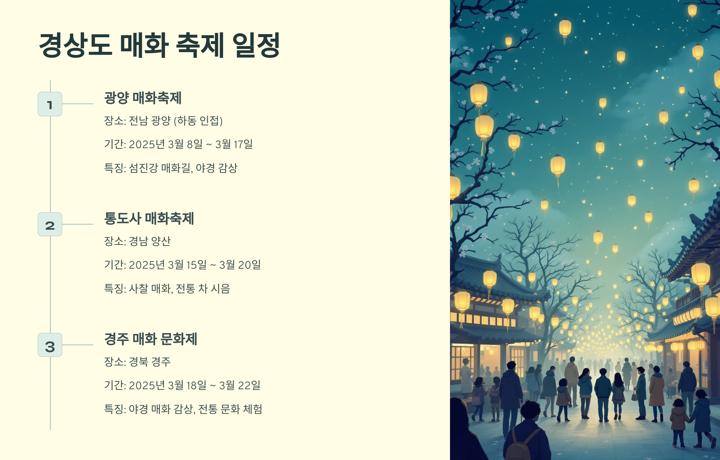 | 경주 매화 문화제 | 경북 경주 | 2025년 3월 18일 ~ 3월 22일 | 야경 매화 감상, 전통 문화 체험 |