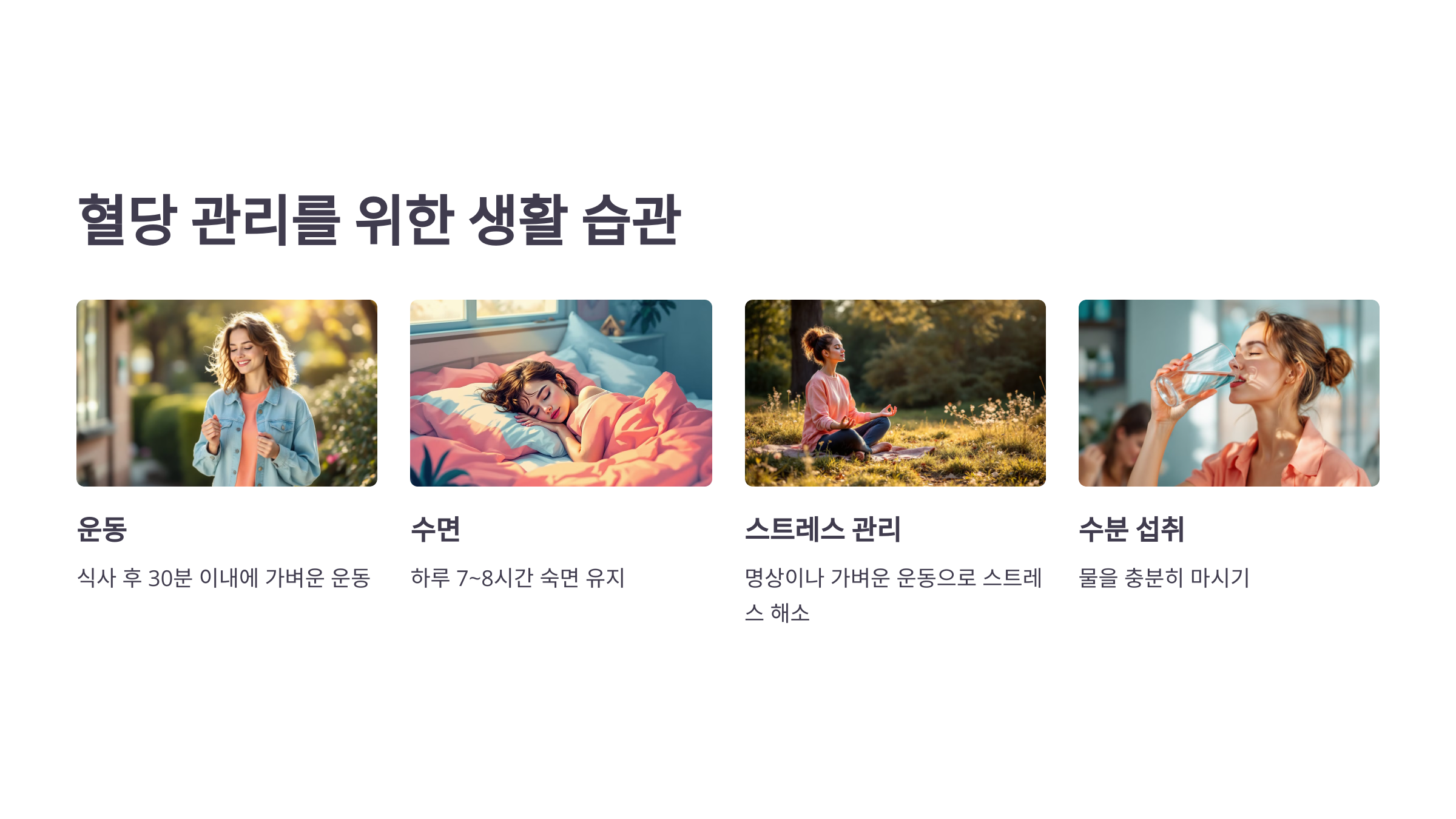 혈당 조절은 단순히 식단 관리만으로 해결되지 않아요. 꾸준한 운동, 스트레스 관리, 수면 습관도 중요한 역할을 해요. 🏃♀️