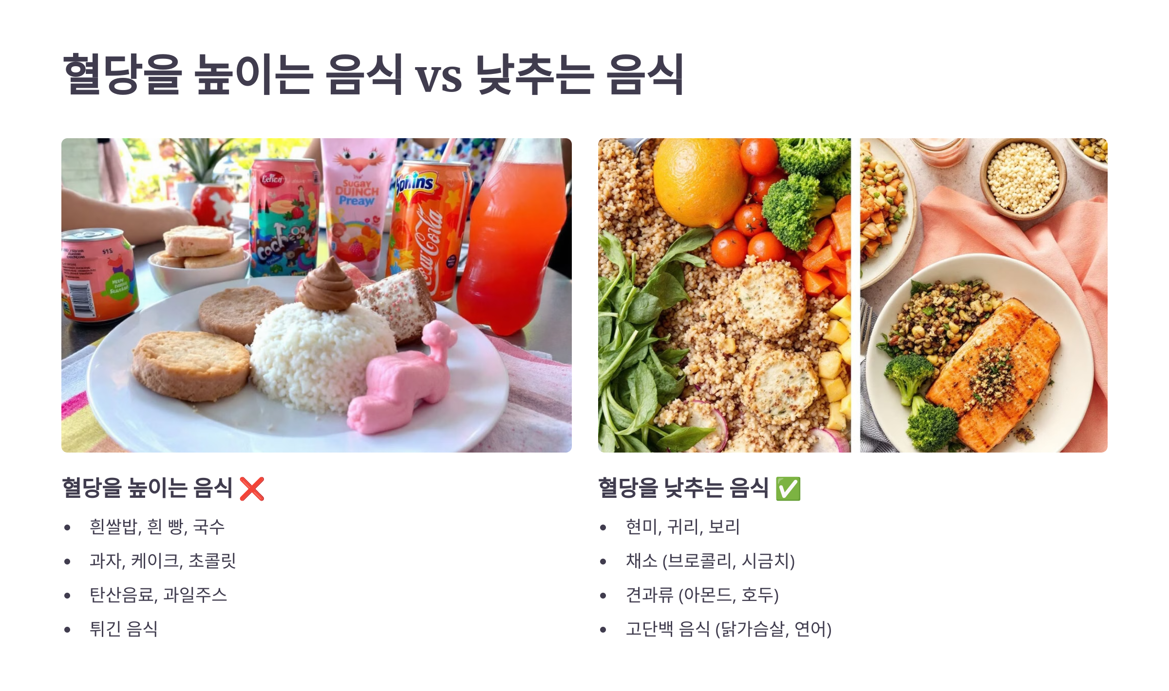 | 혈당을 높이는 음식 ❌ | 혈당을 낮추는 음식 ✅ |