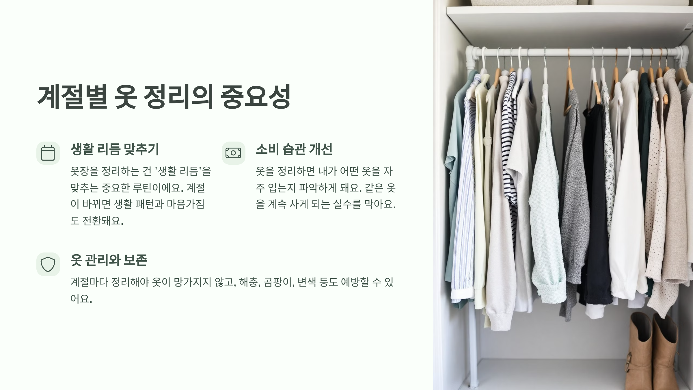 옷 정리는 단순히 공간을 비우는 행위가 아니에요. 옷장을 정리하는 건 ‘생활 리듬’을 맞추는 중요한 루틴 중 하나예요. 계절이 바뀌는 시점에 옷을 정리하면 나의 생활 패턴과 마음가짐도 자연스럽게 전환되기 때문이에요. 🌸❄️