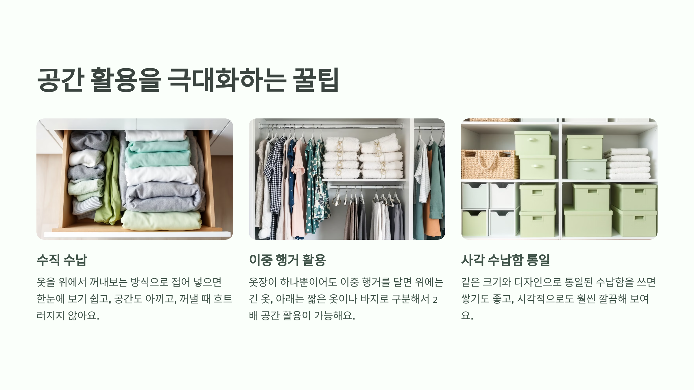 | 수직 수납 | 공간 절약, 보기 쉬움 | 서랍, 티셔츠류 |