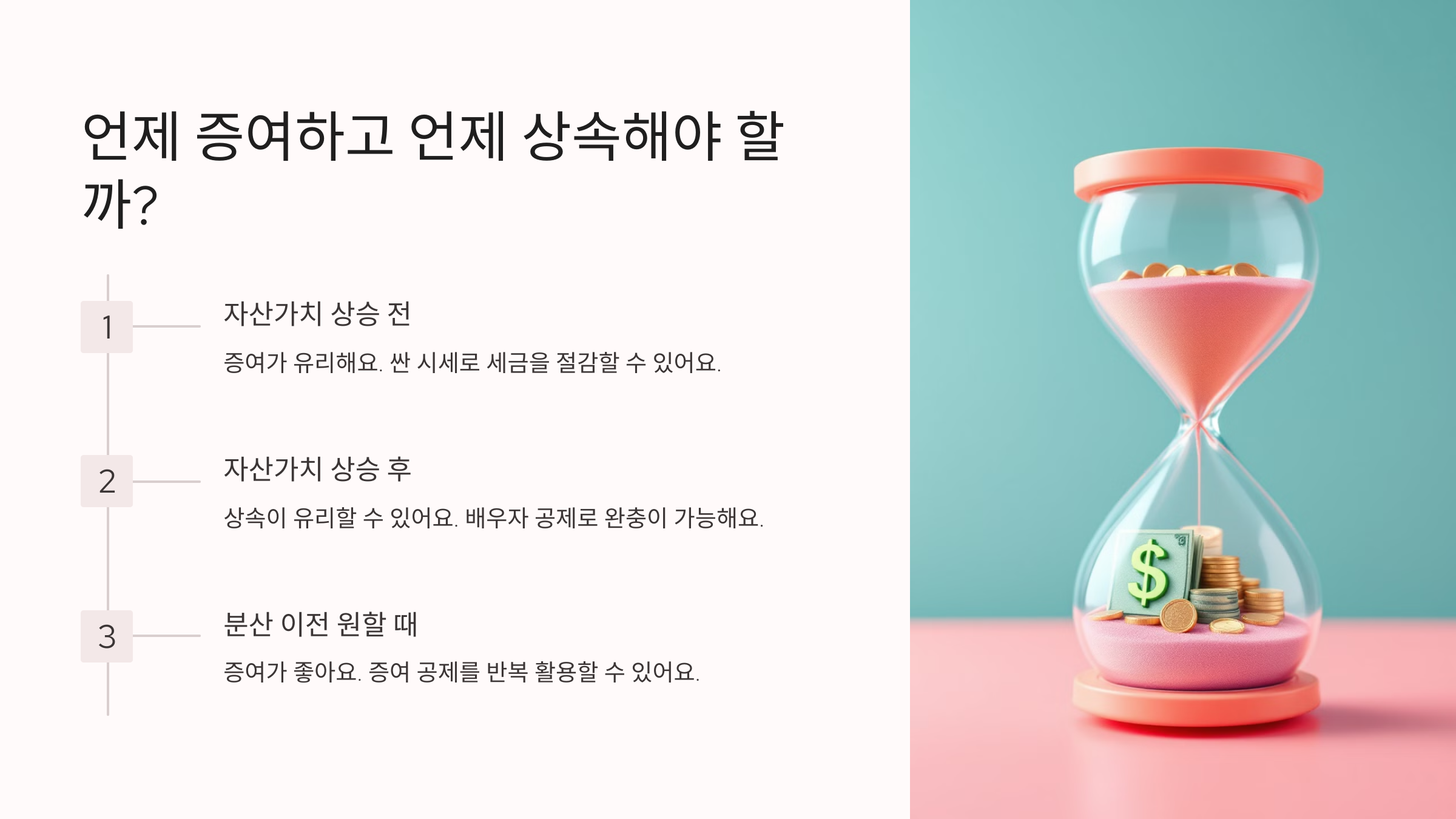 이제 ‘언제’ 상속하거나 증여하느냐에 따라 달라지는 유불리를 알려드릴게요. 타이밍은 정말 중요해요 ⏱️