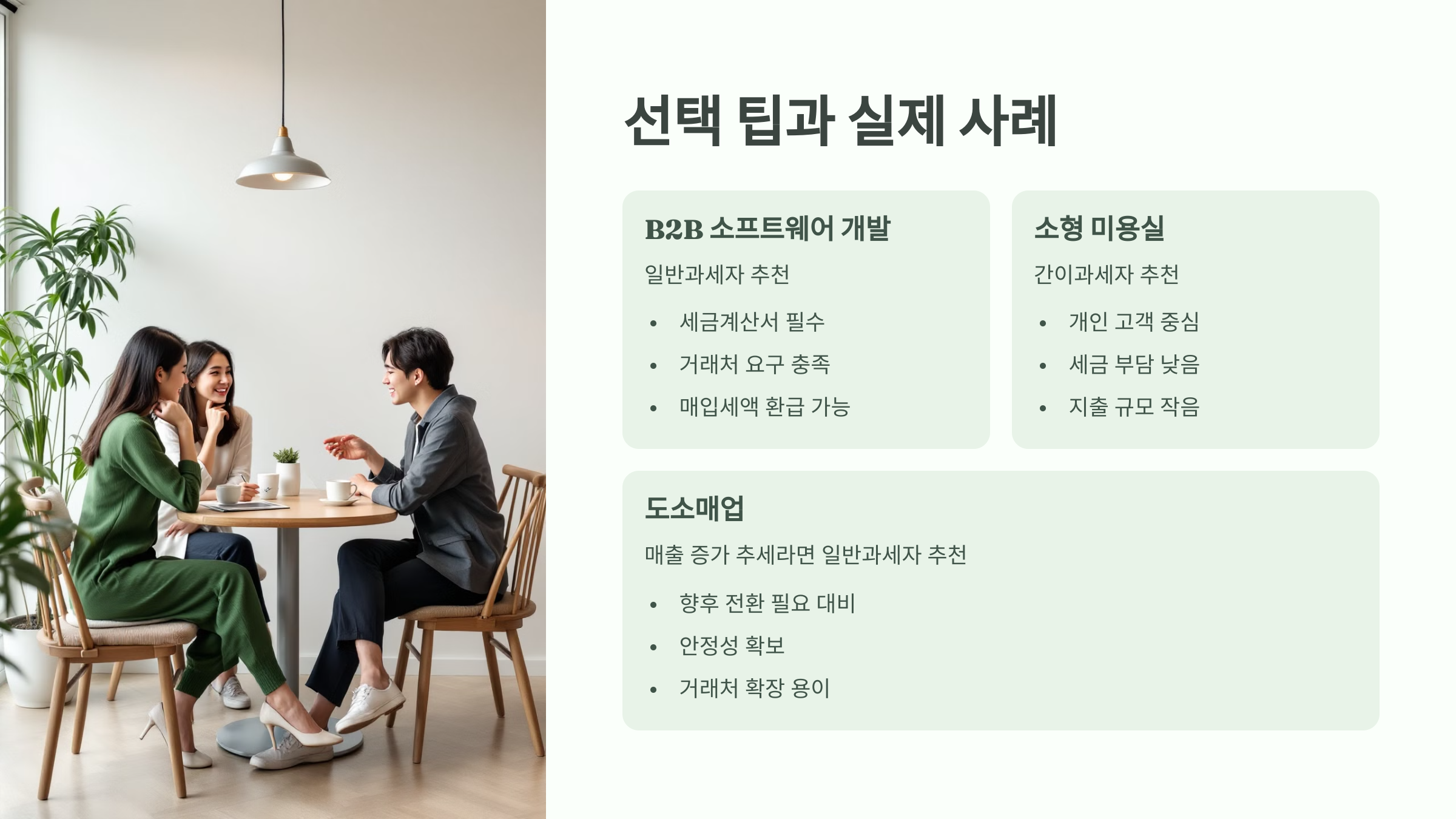과세유형을 선택할 때 가장 중요한 건 사업의 구조와 방향을 파악하는 거예요. 단순히 "세금 적게 내는 게 좋다"는 기준만으로는 오히려 손해를 볼 수 있어요. 아래 몇 가지 상황별 팁과 실제 사례를 보면서 어떤 선택이 더 유리한지 알아볼게요.