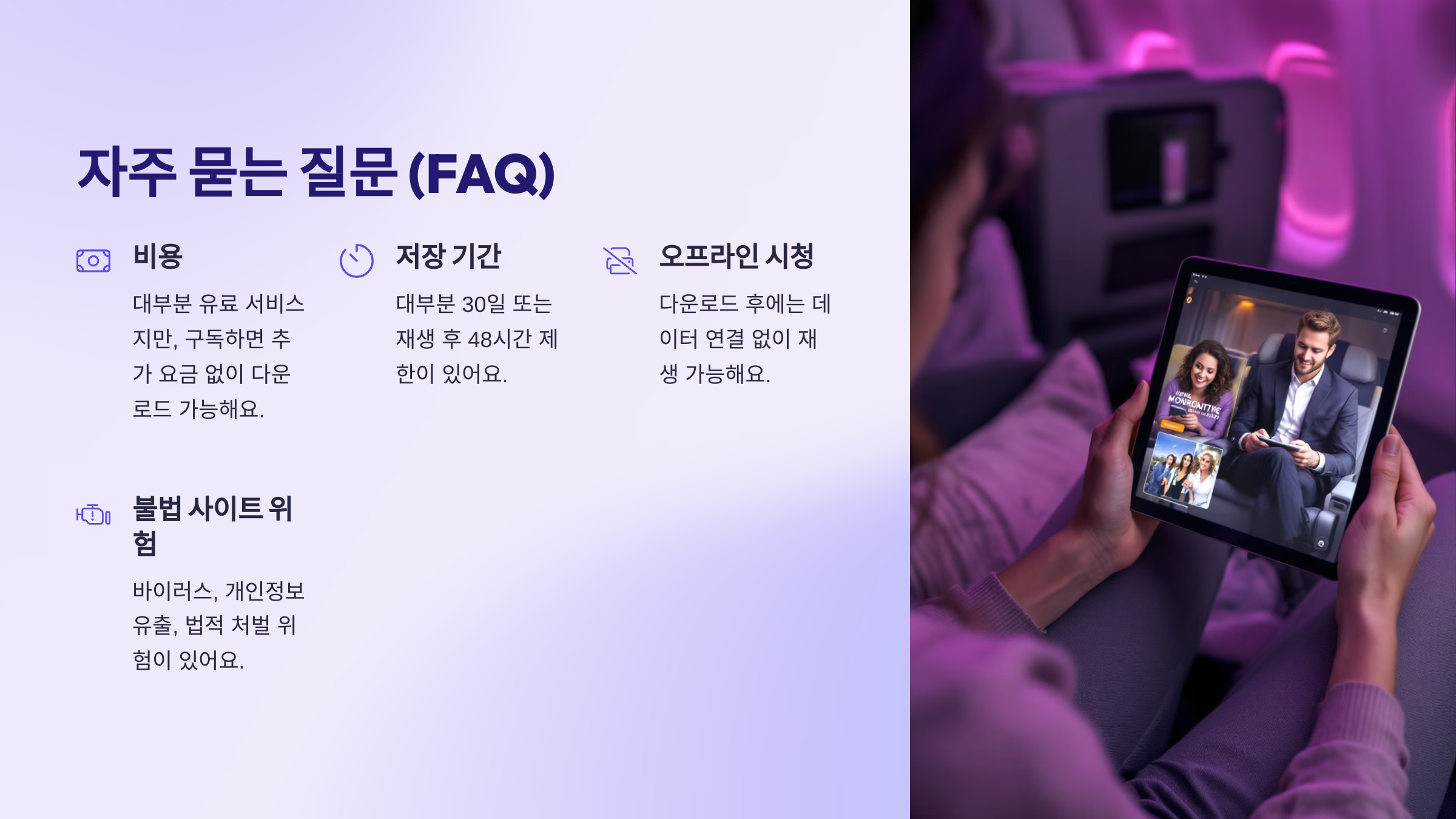 A3. 네! 다운로드 후에는 오프라인 모드에서 재생 가능해요. 비행기, 해외여행, 지하철 등에서도 데이터 없이 감상할 수 있어요.