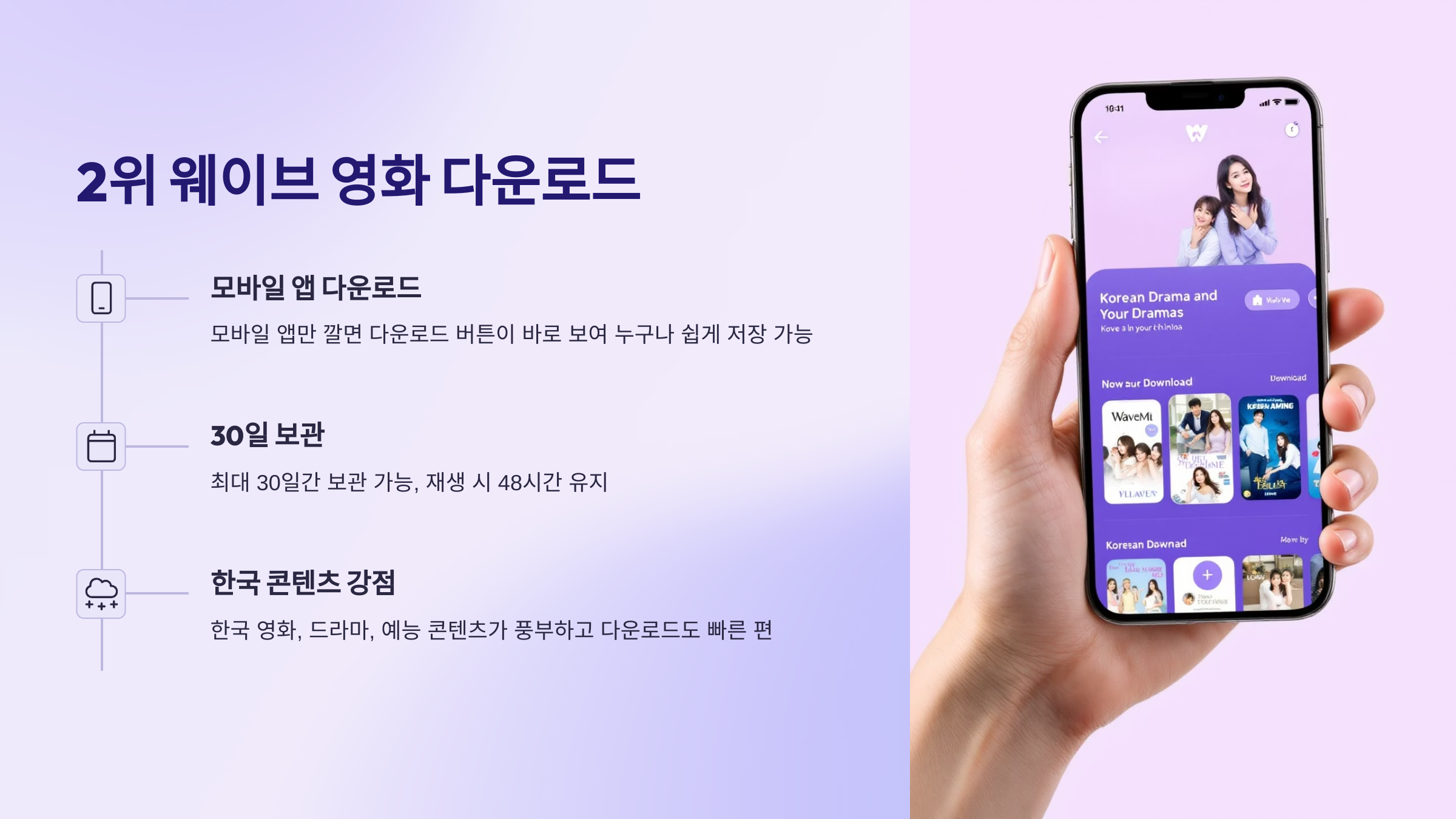 2025년 영화 다운로드 사이트 2위는 바로 웨이브(WAVVE)에요! 웨이브는 국내 OTT 서비스 중 다운로드 기능이 꽤 괜찮은 편이라서 이용자가 많아요. 한국 영화나 드라마, 예능 좋아하는 분들에게 딱 맞는 사이트랍니다.