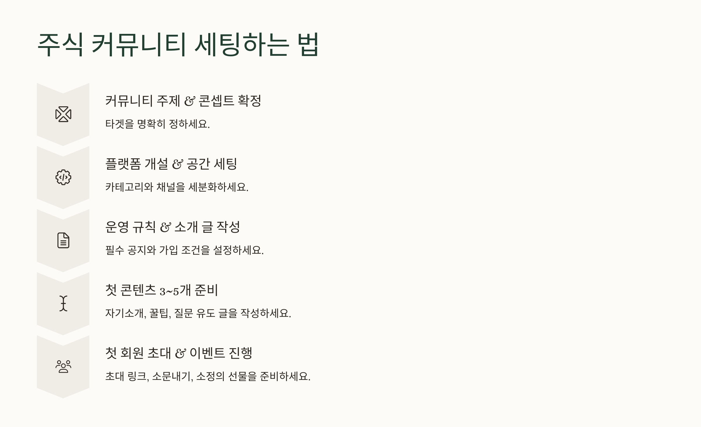 주식 커뮤니티 세팅은 총 5단계 프로세스를 기억하면 정말 편해요. 핵심은 준비 → 공간 만들기 → 룰 세우기 → 콘텐츠 채우기 → 첫 멤버 모집이에요. 순서대로 하나씩 따라하면 금방 내 커뮤니티가 완성될 거예요.