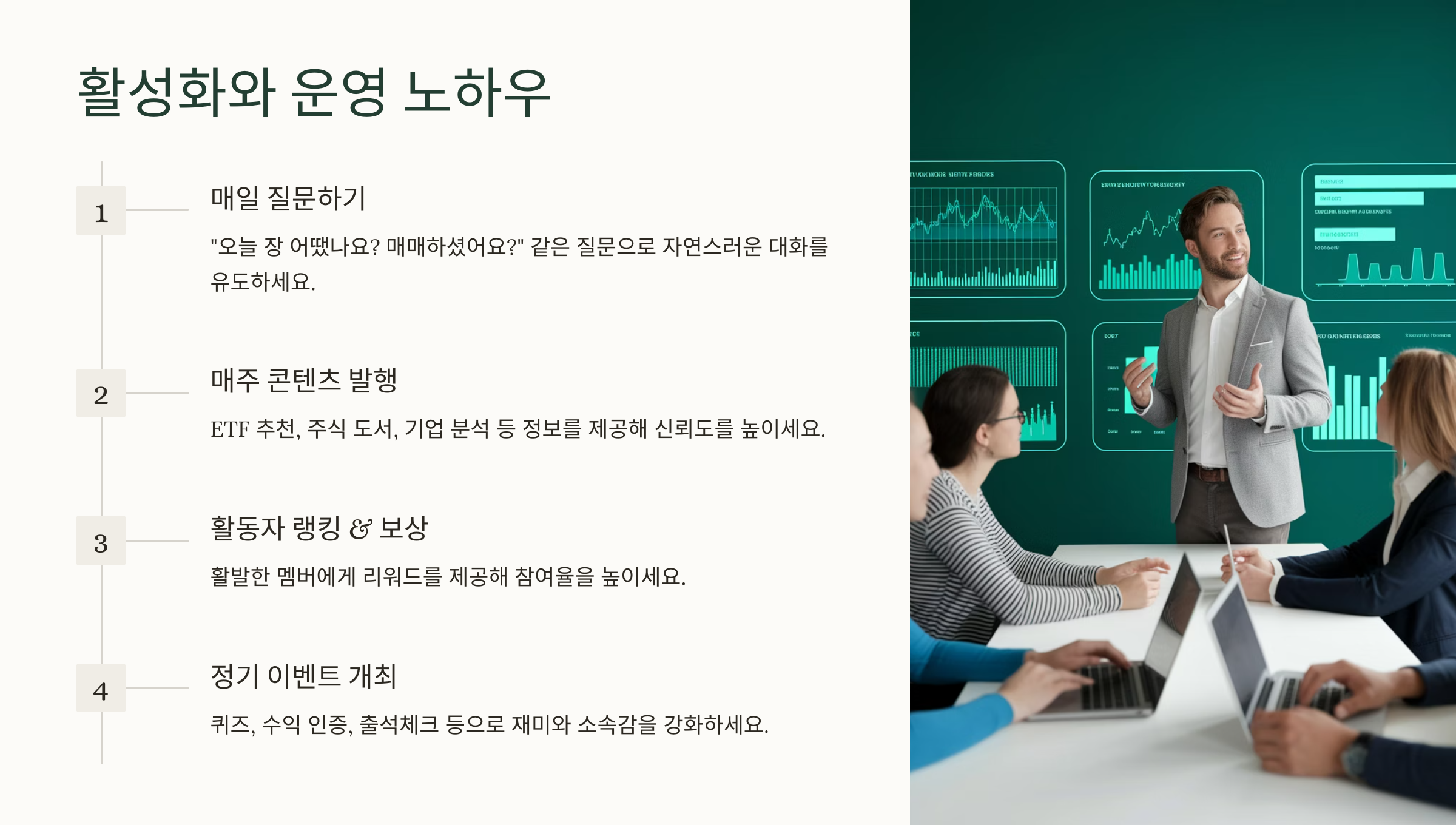 그럼 다음 섹션에서는 주식 커뮤니티가 오래 살아남고 성장할 수 있는 운영 노하우와 활성화 전략을 알려줄게요!