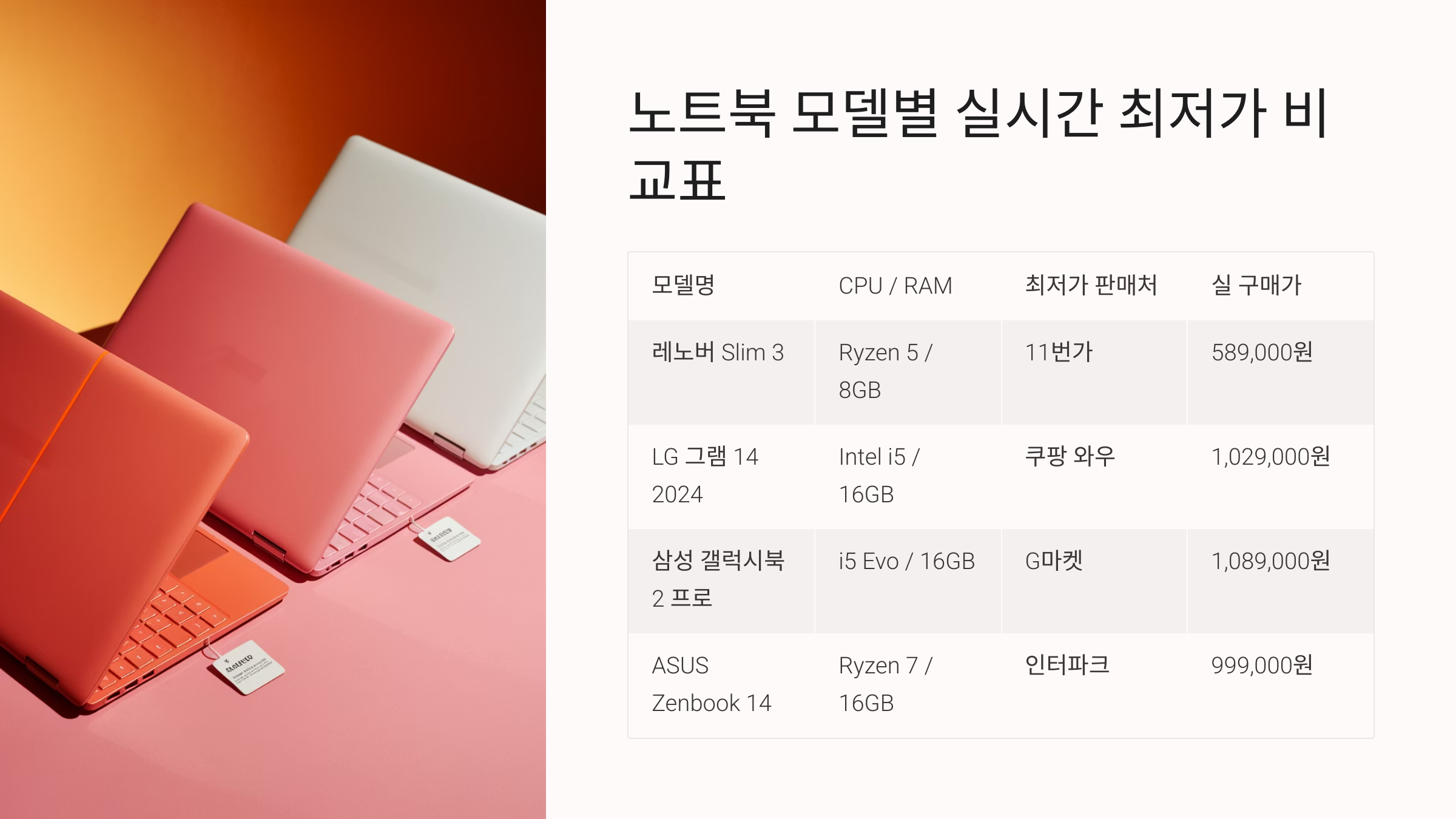 | 모델명 | CPU / RAM | 저장장치 | 최저가 판매처 | 실 구매가 (쿠폰 적용) |