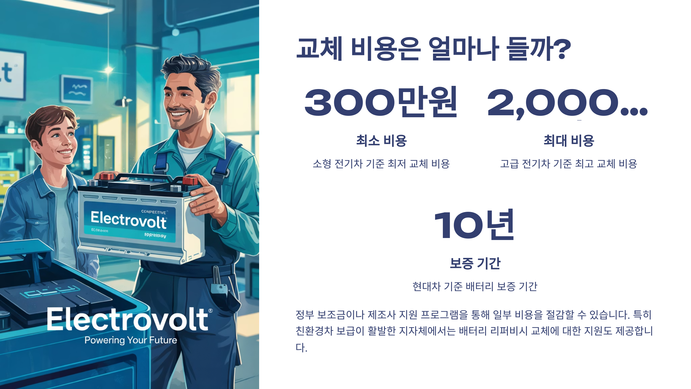 하지만 다행히도, 대부분의 제조사는 배터리에 대해 긴 보증을 제공해요. 예를 들어, 현대는 10년 또는 160,000km, 테슬라는 8년 또는 192,000km까지 배터리 성능을 보증해주기 때문에, 보증 기간 내 문제가 생기면 무상 교체도 가능해요.