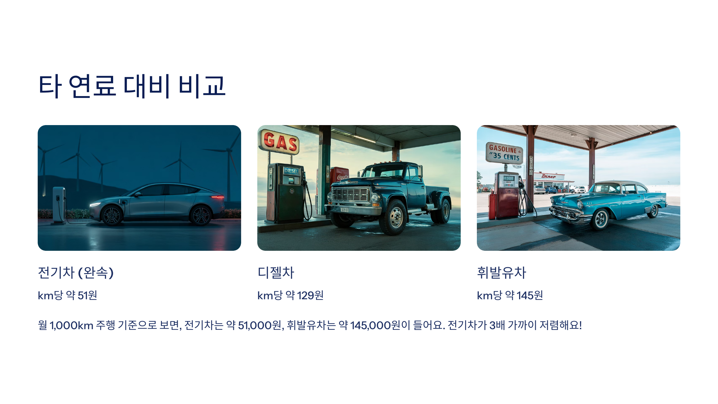 월 1,000km 주행 기준으로 보면, 전기차는 약 51,000원, 휘발유차는 약 145,000원이 들어요. 전기차가 3배 가까이 저렴하다는 계산이 나와요!🚘⚖️