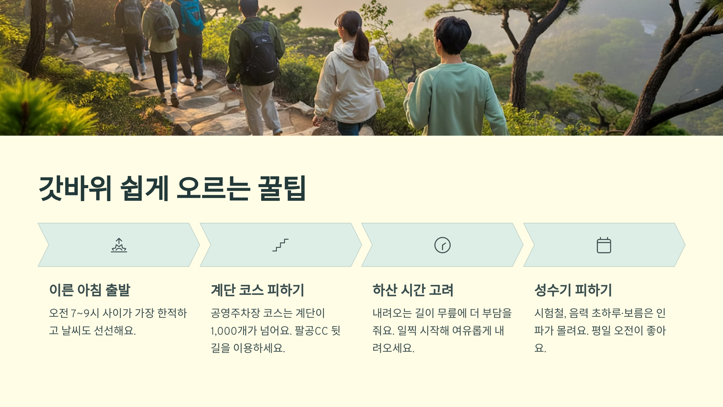 첫 번째 꿀팁은 '이른 아침에 출발하기'에요. 오전 7~9시 사이가 가장 한적하고 날씨도 선선해요. 특히 여름엔 한낮 기온이 올라가기 전에 도착하는 게 체력 소모를 줄일 수 있어요. ☀️