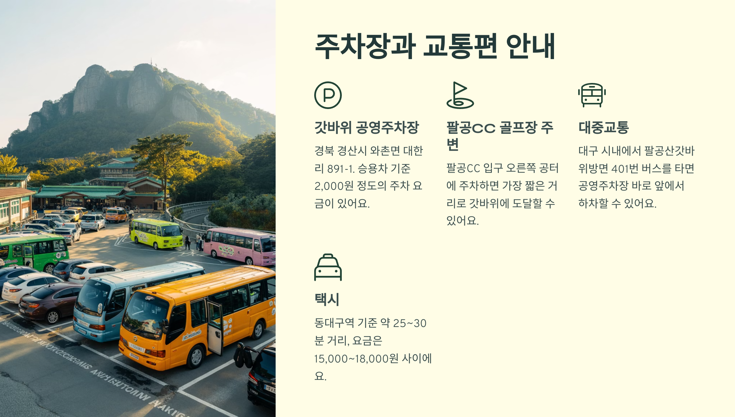 세 번째는 '대중교통'이에요. 대구 시내에서 팔공산갓바위방면 401번 버스를 타면 공영주차장 바로 앞에서 하차할 수 있어요. 경산에서는 간선버스나 농어촌버스를 타고 환승하는 방법도 있답니다. 🚏