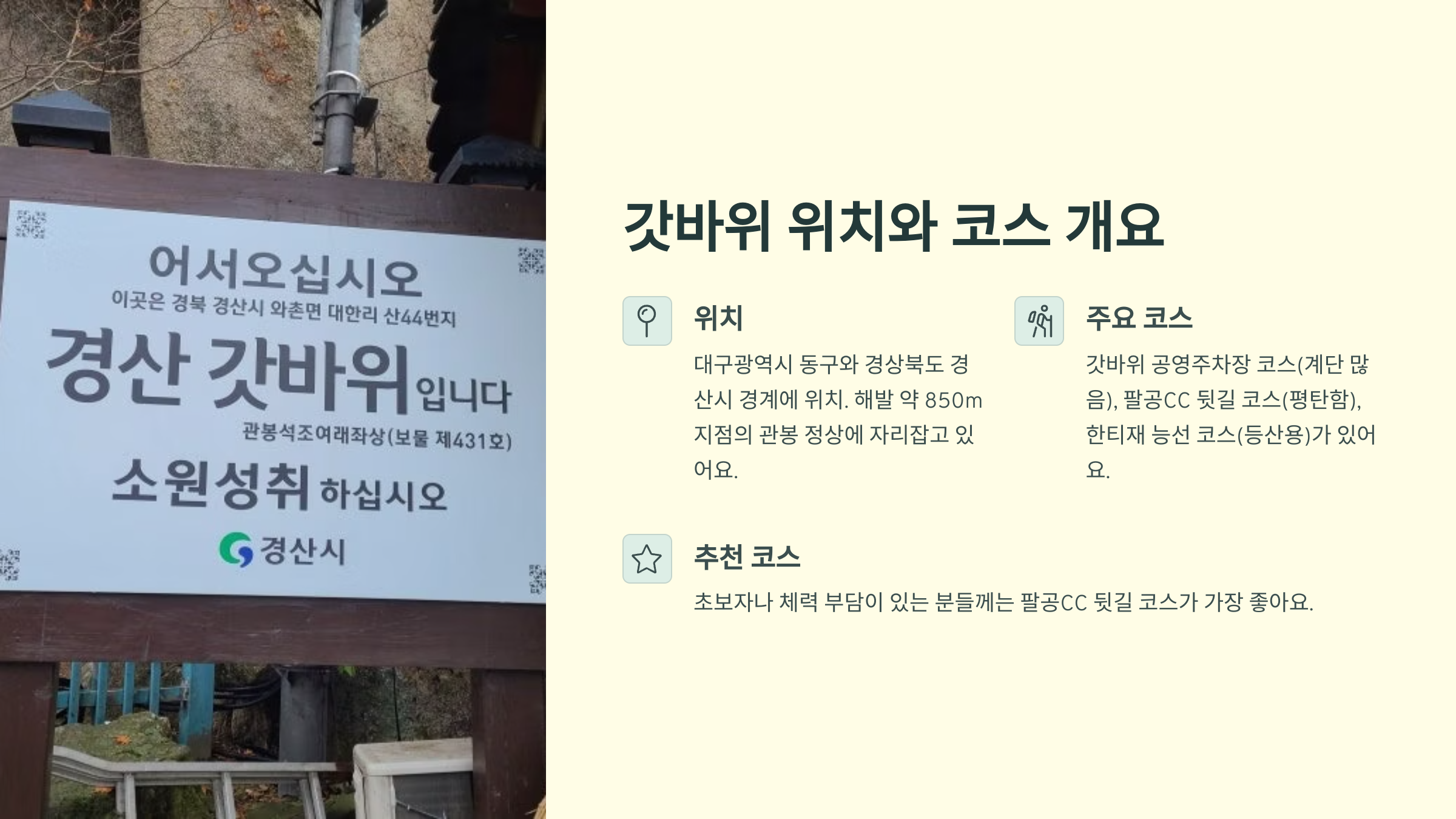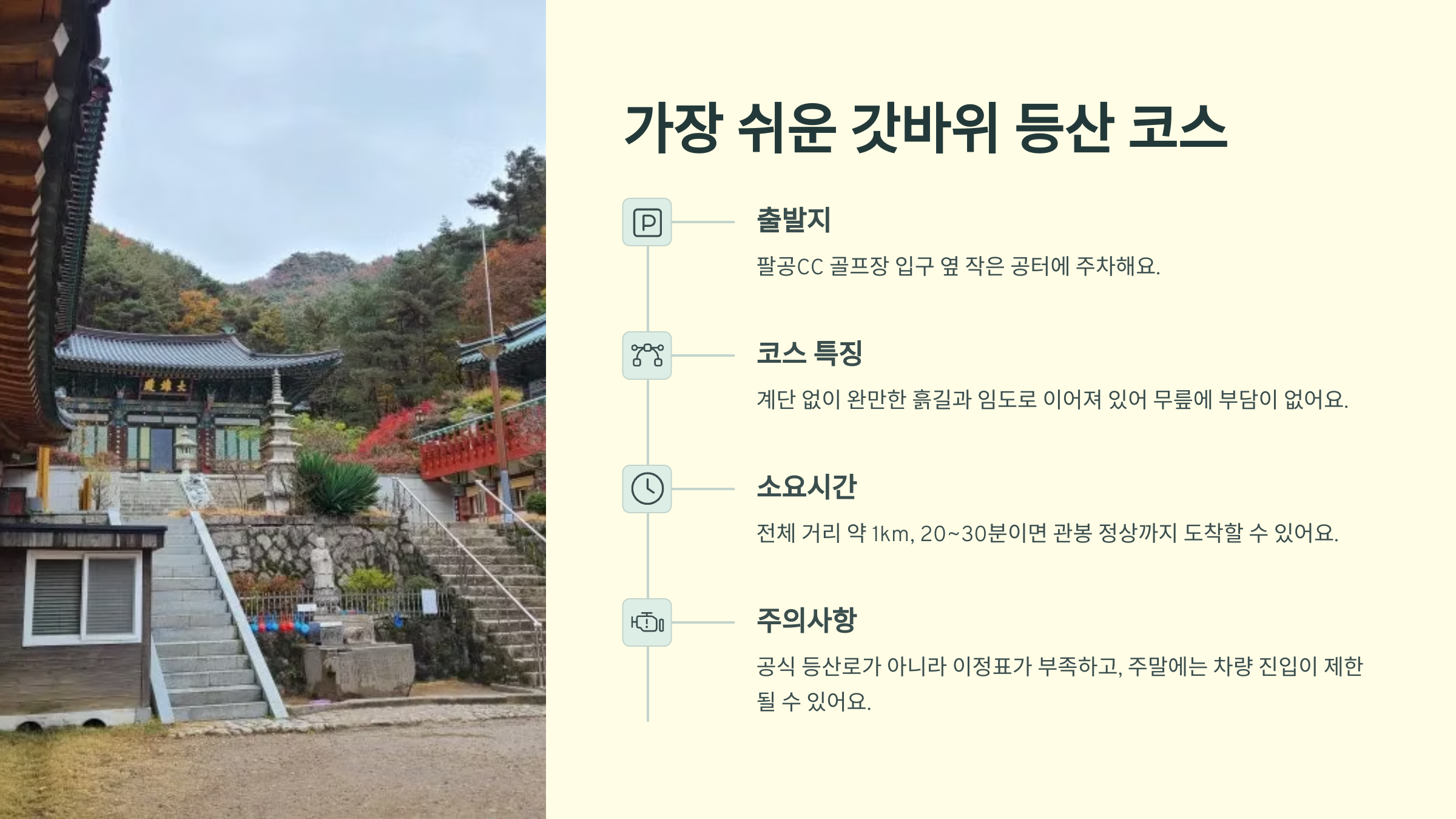 내가 생각했을 때, 팔공산 갓바위는 힘든 계단보다는 조용한 뒷길을 이용할 때 그 진짜 아름다움과 여유로움을 느낄 수 있는 것 같아요. 그래서 오늘은 그 '쉬운 길'을 기준으로 소개할게요. 💛
