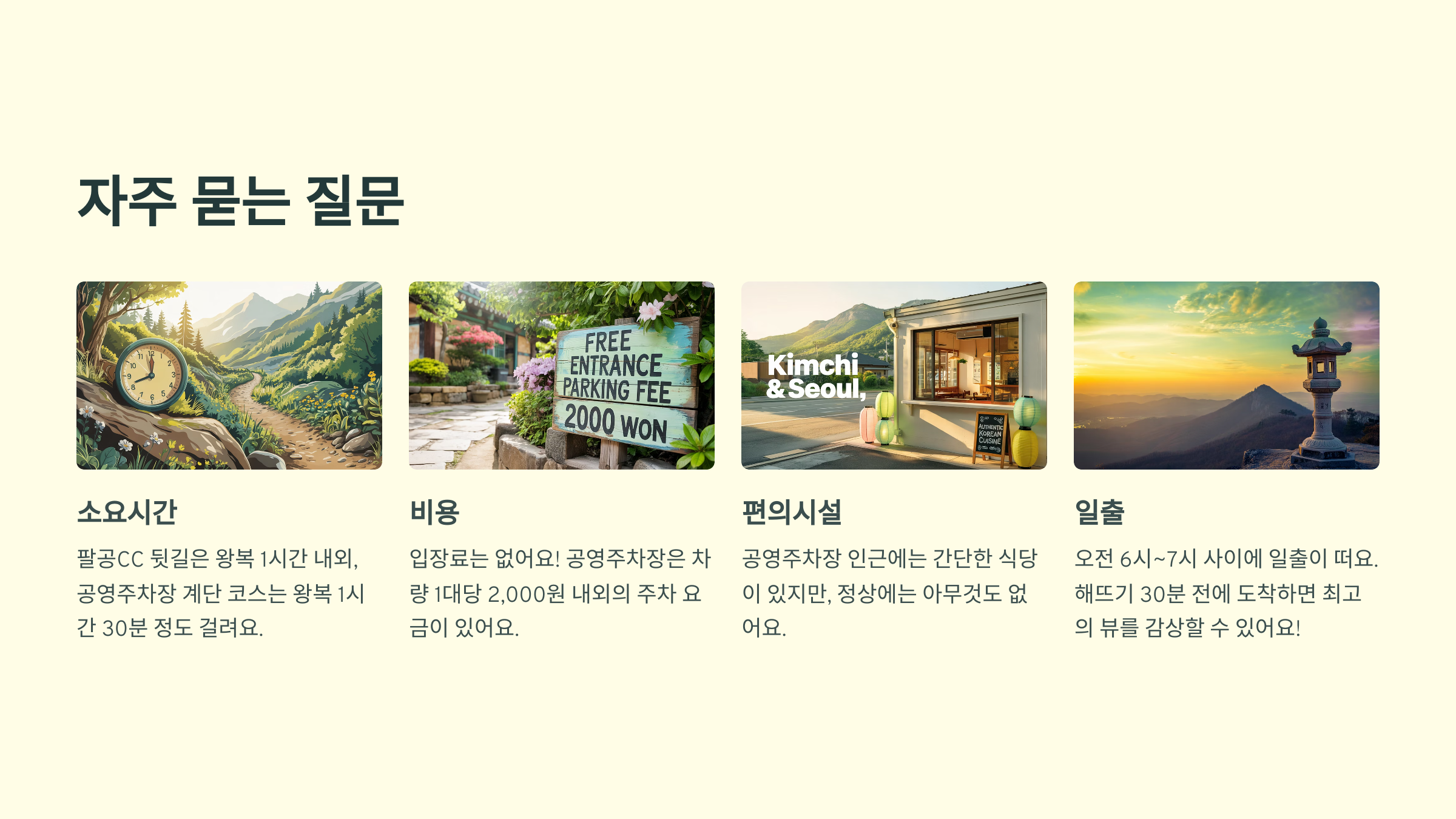 갓바위는 단순한 관광지를 넘어, 마음을 쉬게 하고 새롭게 다짐하게 만드는 장소에요. 마지막으로, 많은 분들이 궁금해하시는 정보들을 FAQ로 정리해드릴게요! 📚
