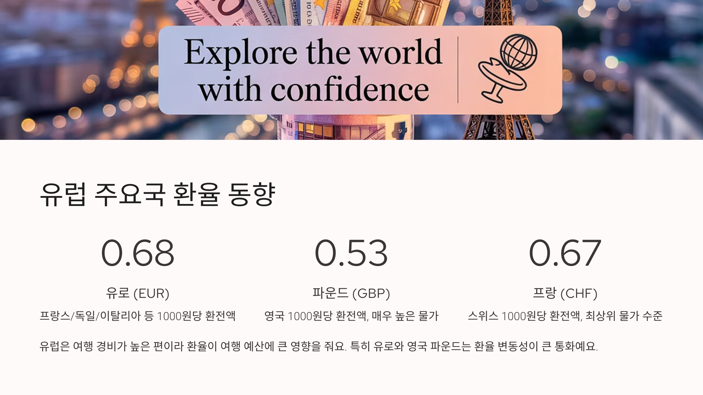 아시아 국가는 환율 변동이 적은 편이지만, 여행 전 1~2주 내 환율 흐름을 보면 더 좋은 타이밍에 환전할 수 있어요. 다음 박스에서는 유럽 지역 국가별 환율도 소개할게요! 🇪🇺