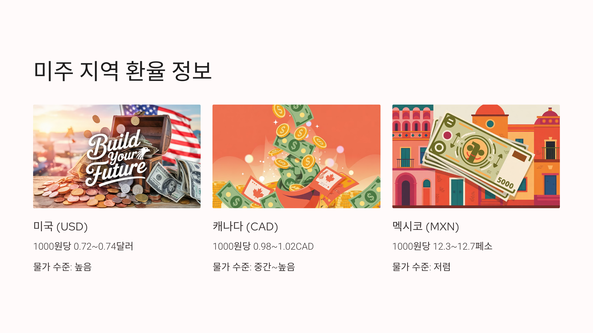 미국과 캐나다는 환율 변동성이 크고, 카드 사용이 일반화되어 있어서 '환율 타이밍'에 따라 환전 금액 차이가 많이 나요. 2025년 4월 기준 미주 지역 환율은 다음과 같아요.