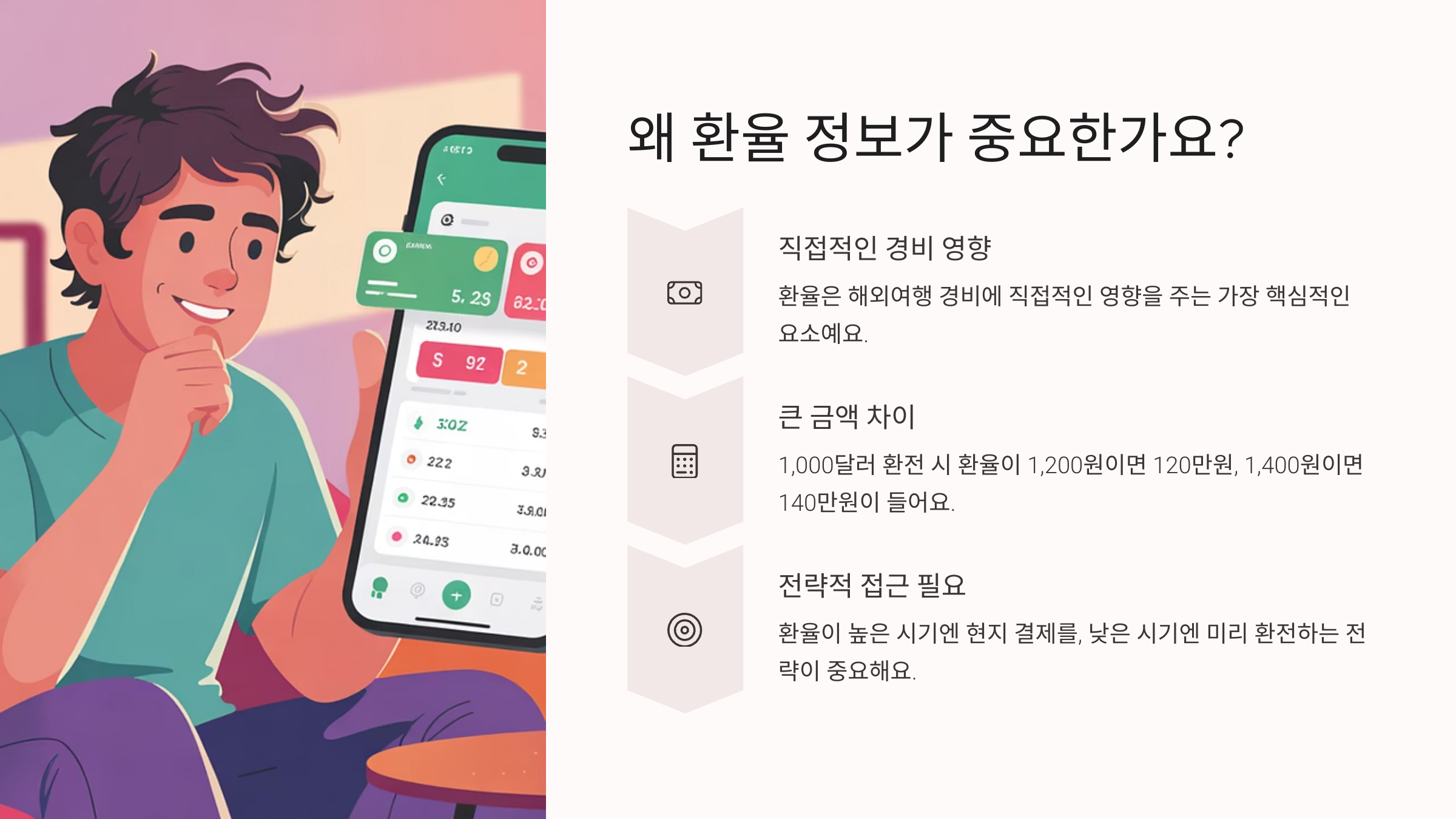 내가 생각했을 때 여행 예산의 절반은 '환율 타이밍'에서 결정되는 것 같아요. 몇 원 차이로 전체 금액이 수십만 원씩 차이 나니까요!