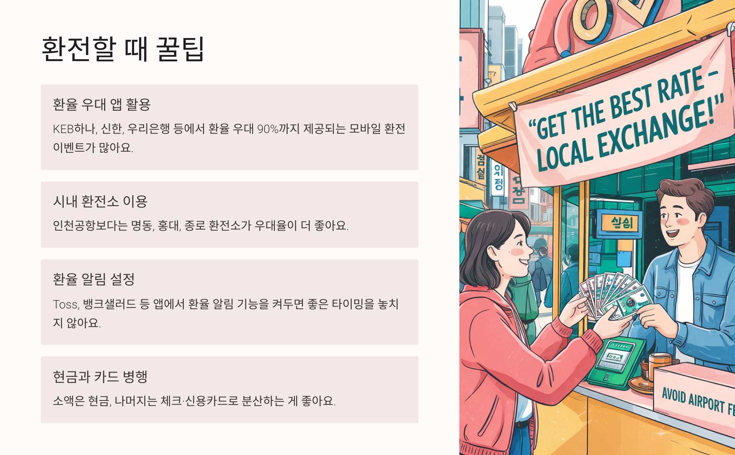 또한 환율이 높은 시기엔 현지 결제(카드)를 활용하고, 환율이 낮은 시기엔 미리 환전해두는 식의 전략도 중요해요. 최근에는 모바일 환전, 앱 실시간 알림 기능 등을 통해 편하게 환율 관리를 할 수 있어요. 📱
