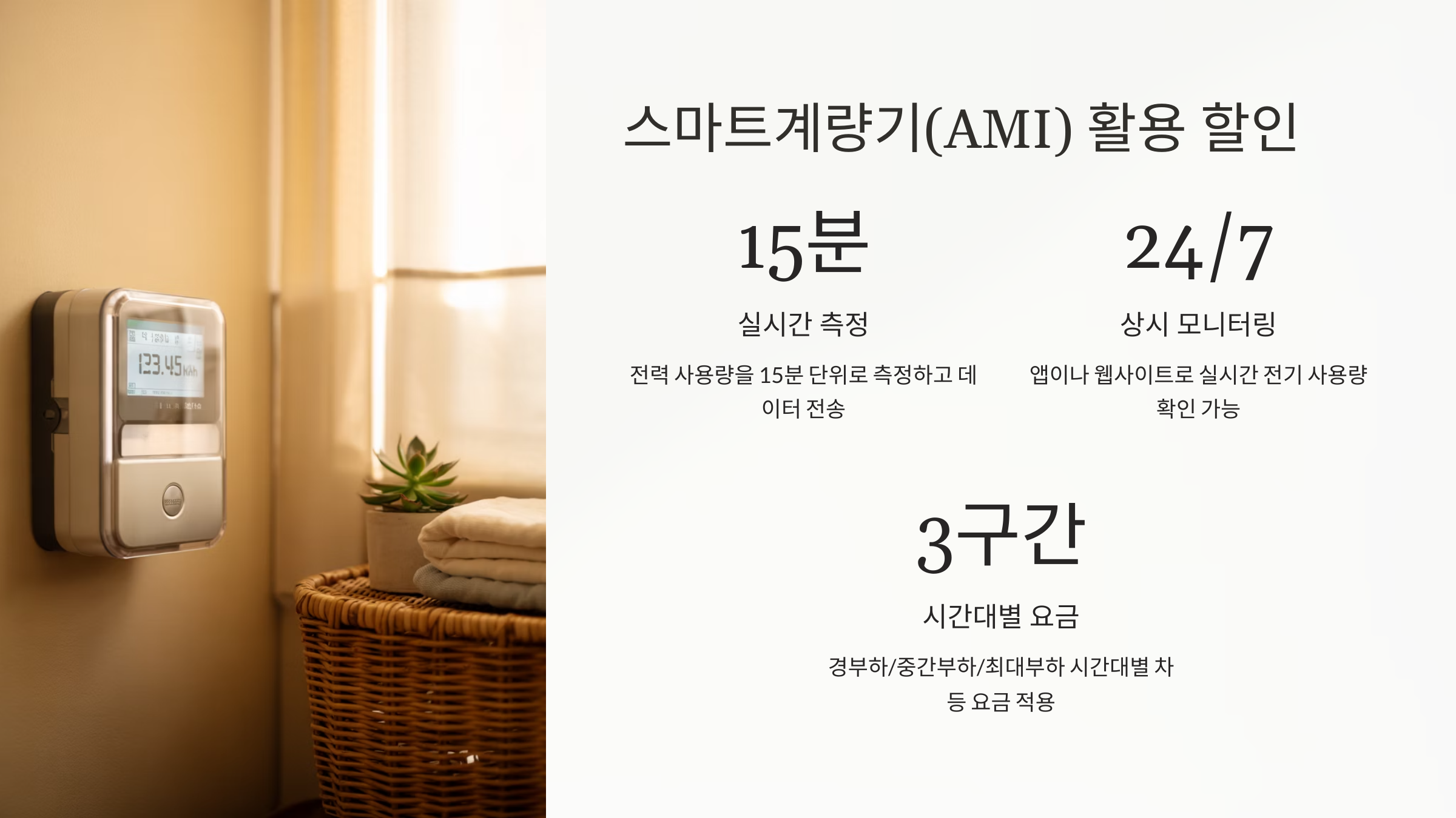 이제 스마트계량기(AMI) 활용 할인에 대해 알아볼게요! 시간대 요금제는 이 스마트 기기 덕분에 가능한 거랍니다 📡