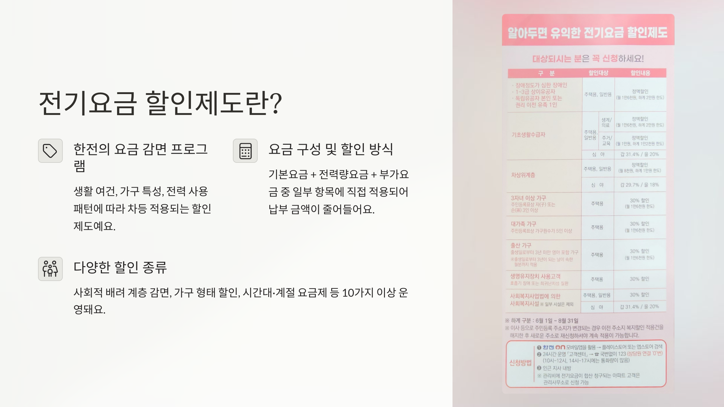 전기요금 할인제도는 한국전력공사(한전)가 다양한 고객군을 위해 제공하는 요금 감면 프로그램이에요. 생활 여건, 가구 특성, 전력 사용 패턴에 따라 차등 적용되며, 매월 고정적으로 할인되거나, 한시적 혜택으로 적용되기도 해요.