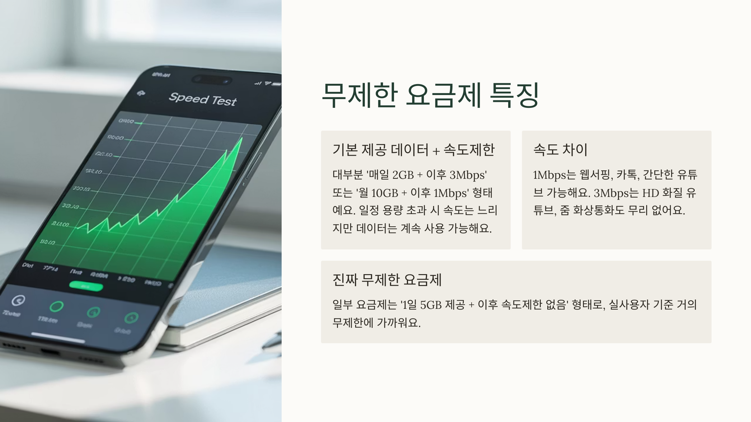 이제 알뜰폰의 기본 구조를 이해했다면, 다음은 우리가 가장 관심 있는 데이터 무제한 요금제에 대해 알아봐야겠죠? 속도, 가격, 조건까지 꼼꼼히 따져봐야 해요!