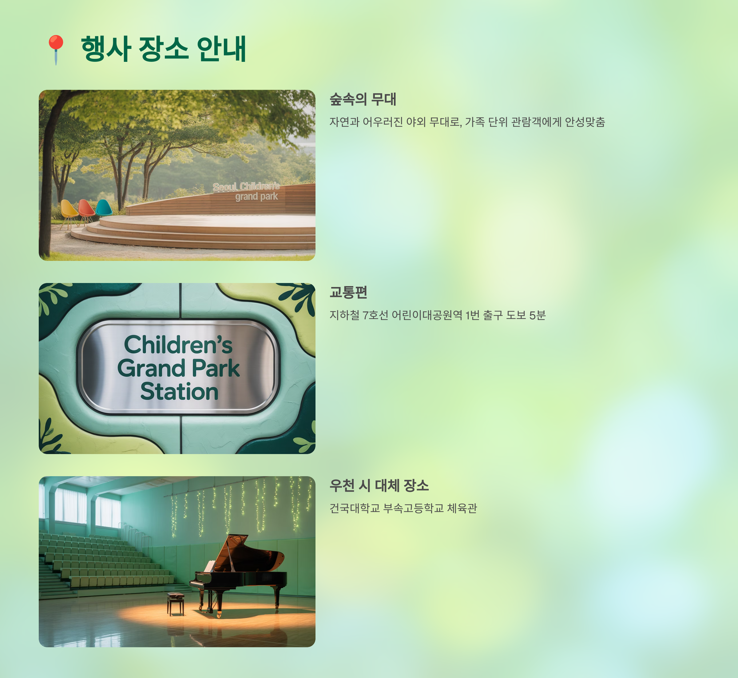 본 행사는 서울 광진구에 위치한 어린이대공원 내 숲속의 무대에서 개최됩니다. 자연과 어우러진 야외 무대로, 가족 단위 관람객들에게 안성맞춤인 장소입니다.3333