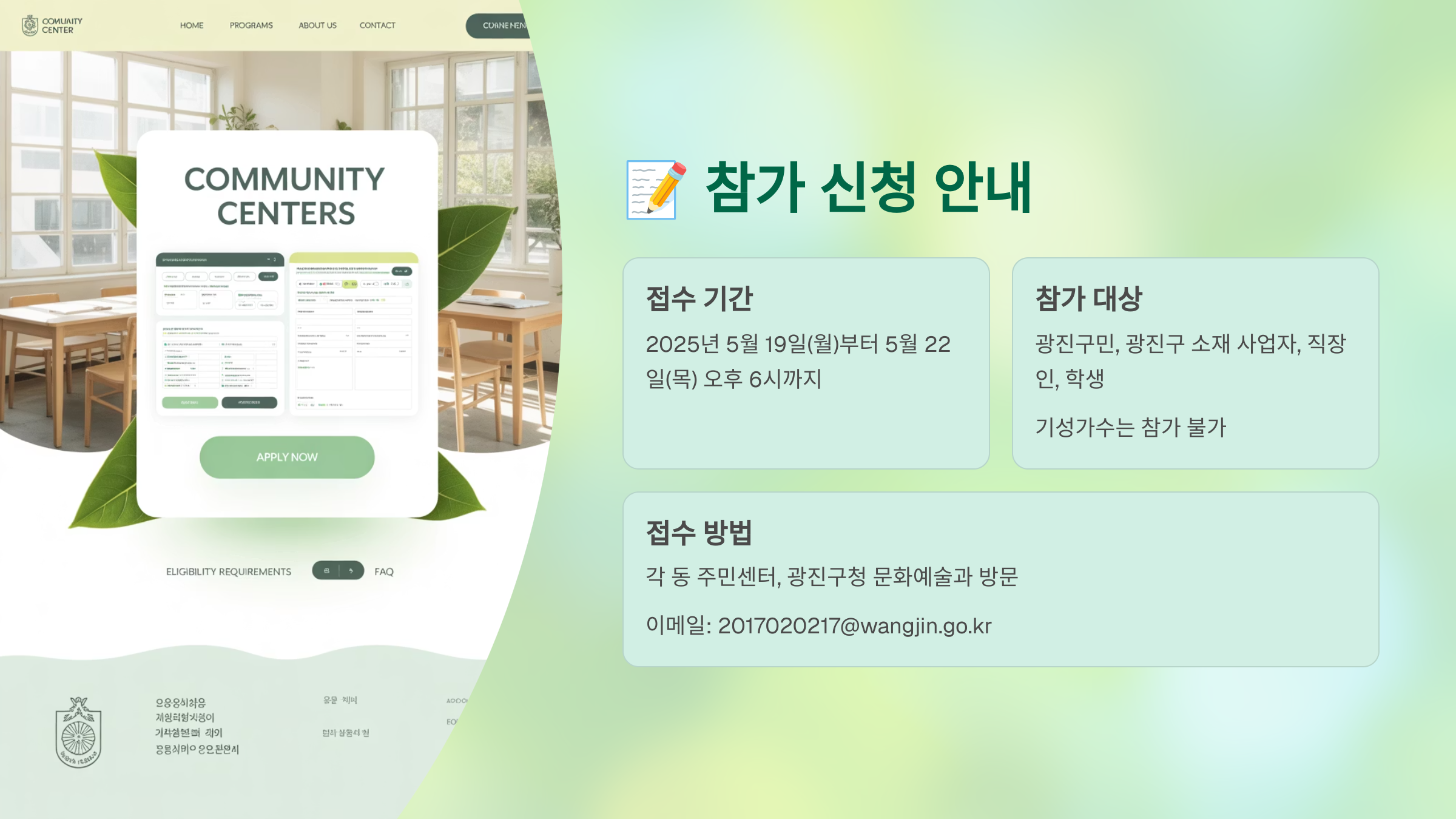 • 광진구청 문화예술과 (서울시 광진구 아차산로 400, 통합청사 13층)
