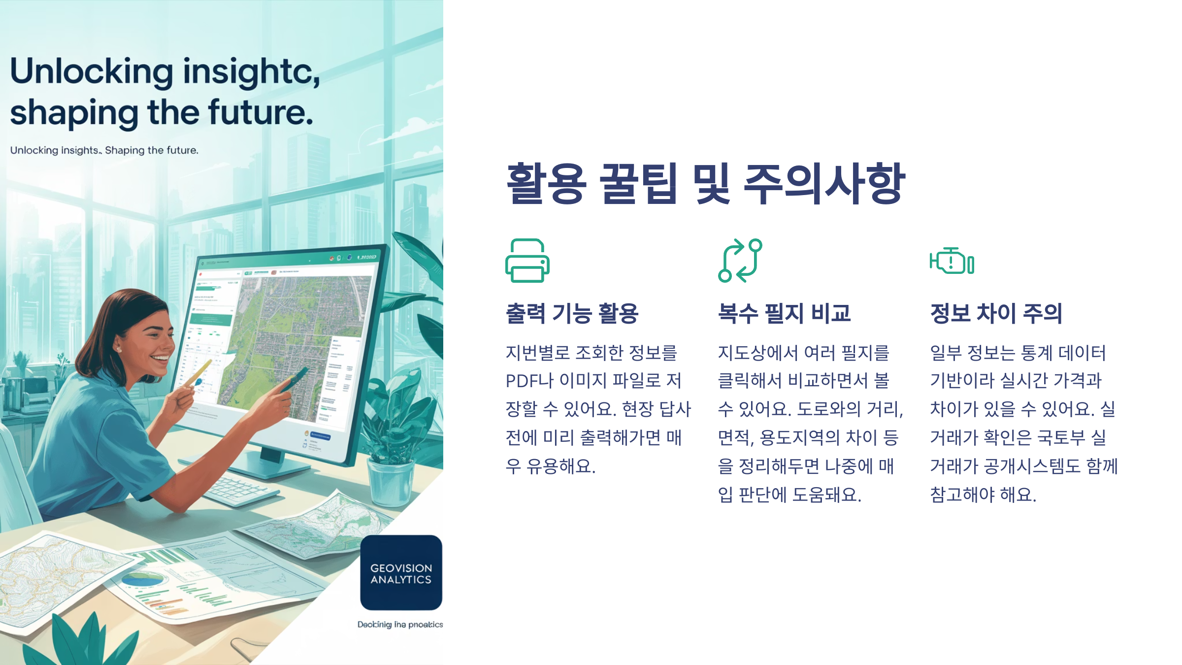 지번별로 조회한 정보를 PDF나 이미지 파일로 저장할 수 있어요. 현장 답사 전에 미리 출력해가면 매우 유용해요. 특히 토지이용계획, 항공사진, 연속지적도 등을 한 장에 출력하면 설명용으로도 딱이에요.