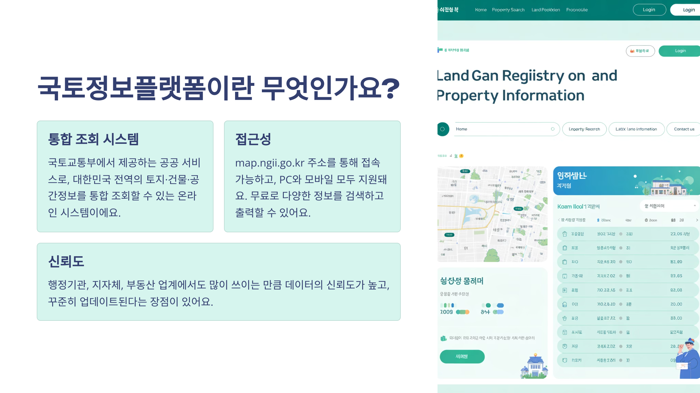 한마디로 ‘대한민국 국토의 모든 정보를 가장 정확하고 빠르게 확인할 수 있는 창구’라고 할 수 있어요. 일반인도 공공데이터를 쉽게 활용할 수 있도록 UX도 점점 개선되고 있어서 접근성도 좋아요. 🙌