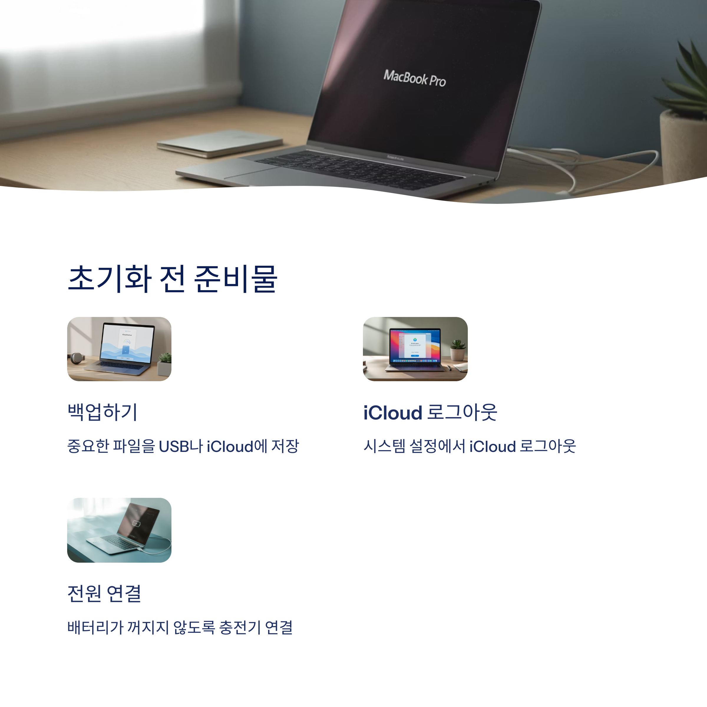 초기화는 시간이 오래 걸릴 수 있어요. 맥북 배터리가 꺼지면 중간에 멈출 수 있으니까, 꼭 전원을 꽂고 시작해야 해요.