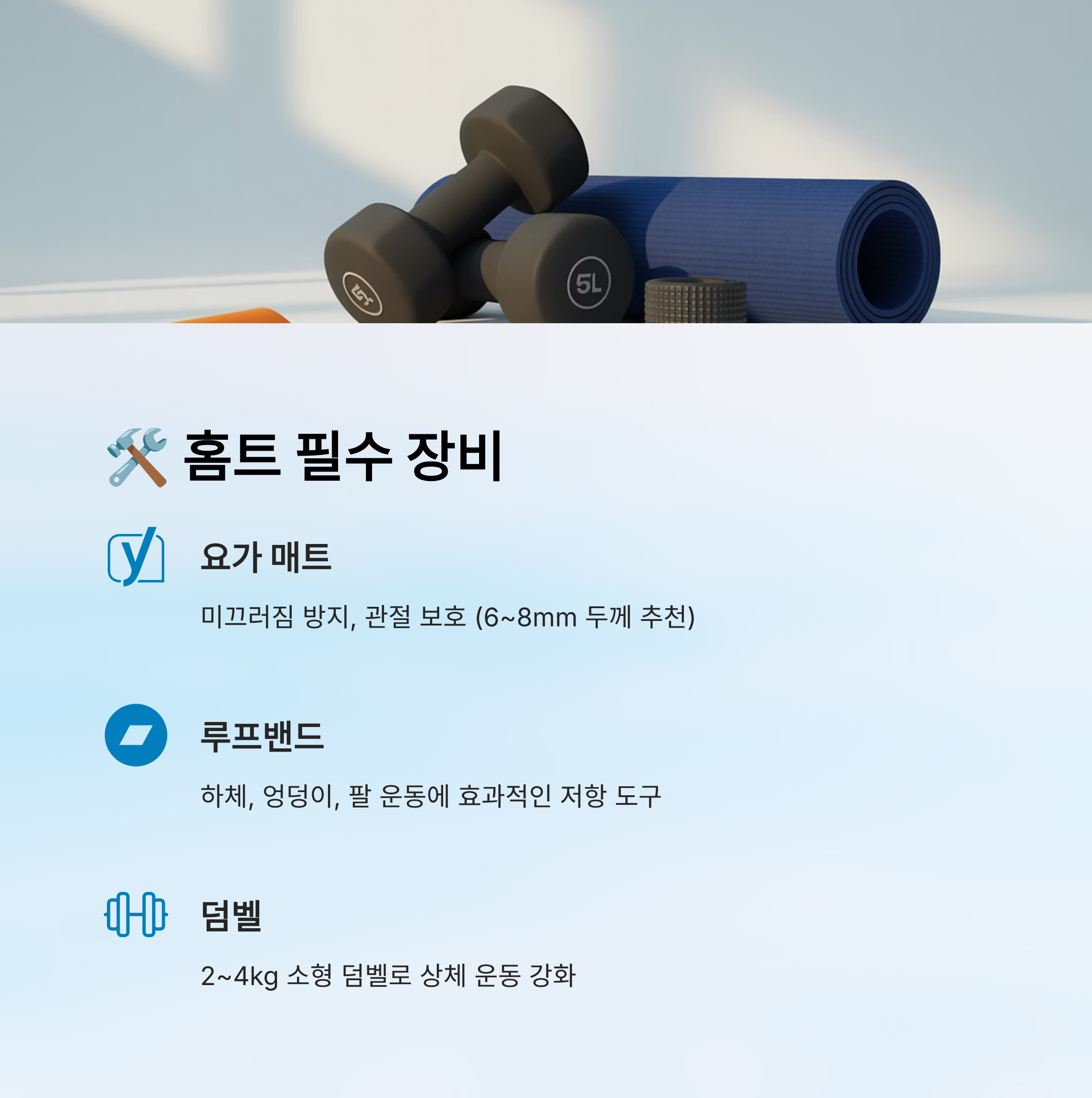 홈트는 맨몸으로도 충분하지만, 간단한 도구만 있어도 효과는 두 배가 돼요! 집에 하나쯤 두고 사용하면 루틴에 다양성이 생기고 자극 부위도 확실해져요. 무조건 비싼 장비보다 활용도 높은 아이템이 좋아요.