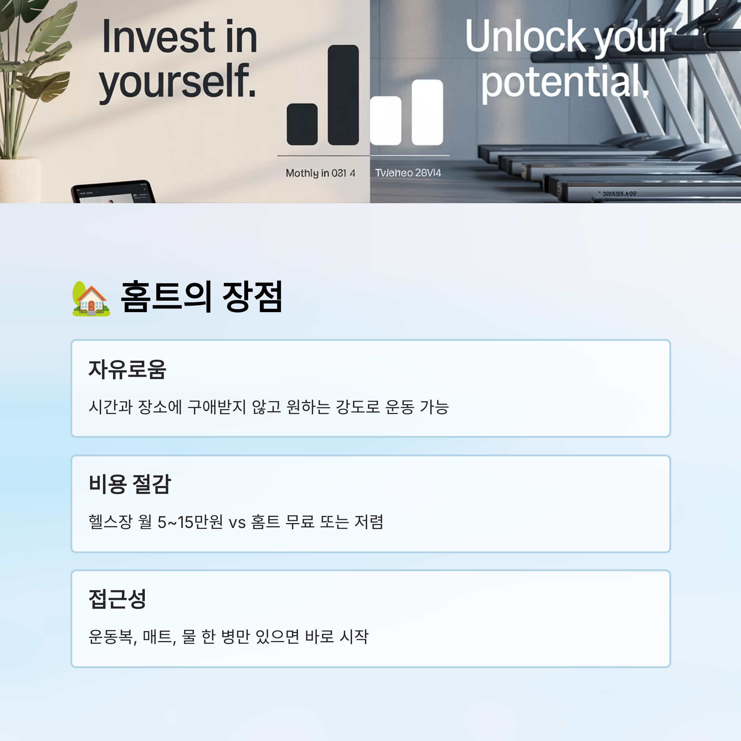 또한, 헬스장 비용을 아낄 수 있다는 점도 장점이에요. 요즘은 유튜브나 앱으로 무료로 운동을 배울 수 있는 시대라서, 콘텐츠만 잘 골라도 트레이너 없이도 충분히 체계적으로 할 수 있어요.