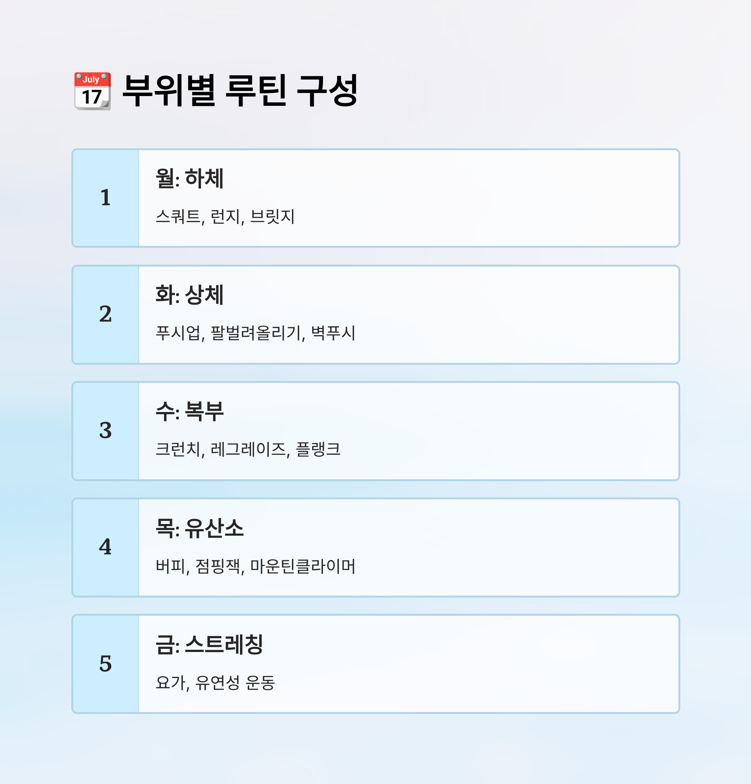 ▶ 월: 하체 (스쿼트, 런지, 브릿지) ▶ 화: 상체 (푸시업, 팔벌려올리기, 벽푸시) ▶ 수: 복부 (크런치, 레그레이즈, 플랭크) ▶ 목: 전신 유산소 (버피, 점핑잭, 마운틴클라이머) ▶ 금: 요가 & 스트레칭