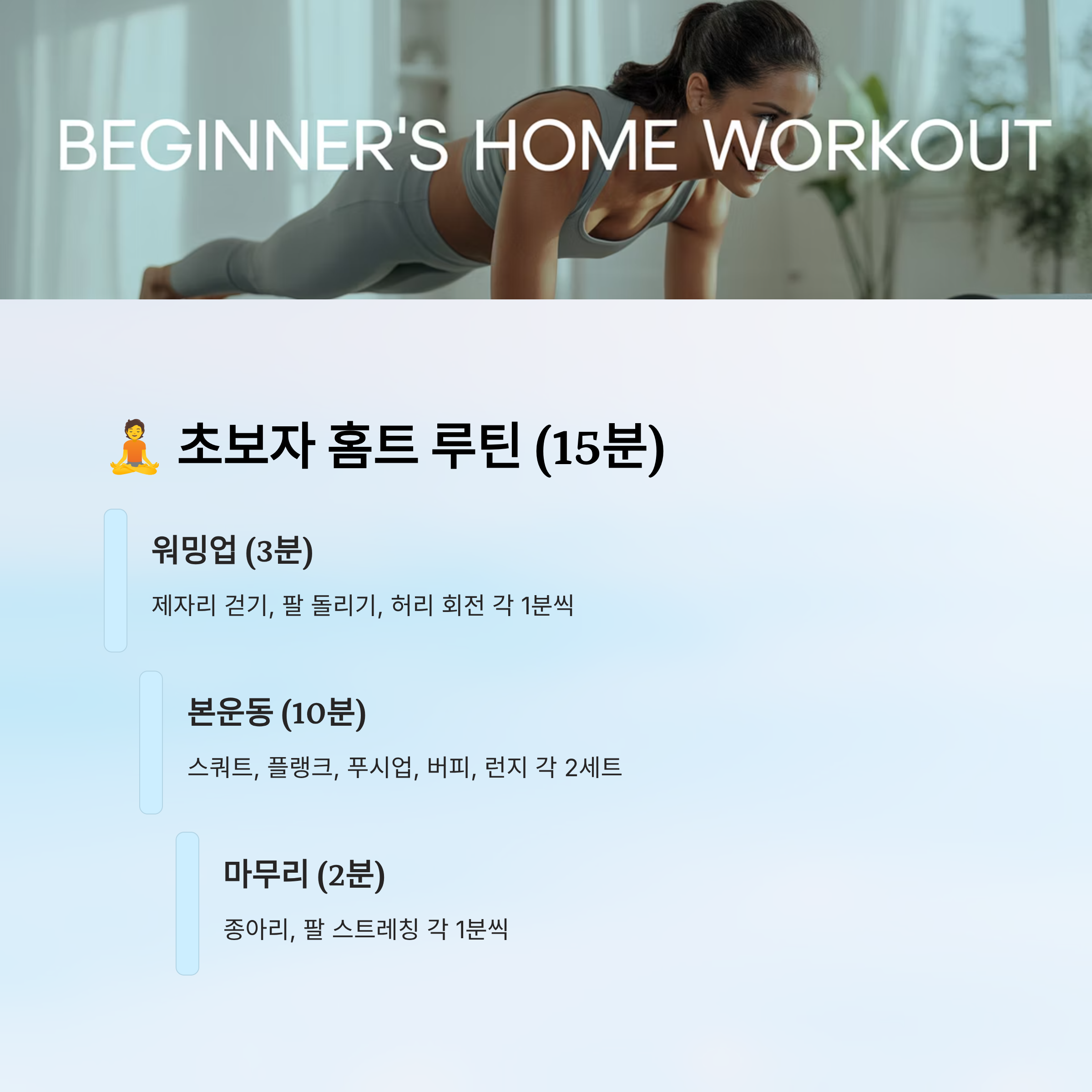 초보자라면 우선 하루 15~20분씩 꾸준히 시작해보는 걸 추천해요. 처음부터 무리하면 오히려 근육통이나 의욕 저하로 중도 포기할 수 있어요. 운동 루틴은 짧게, 정확하게가 핵심이에요.