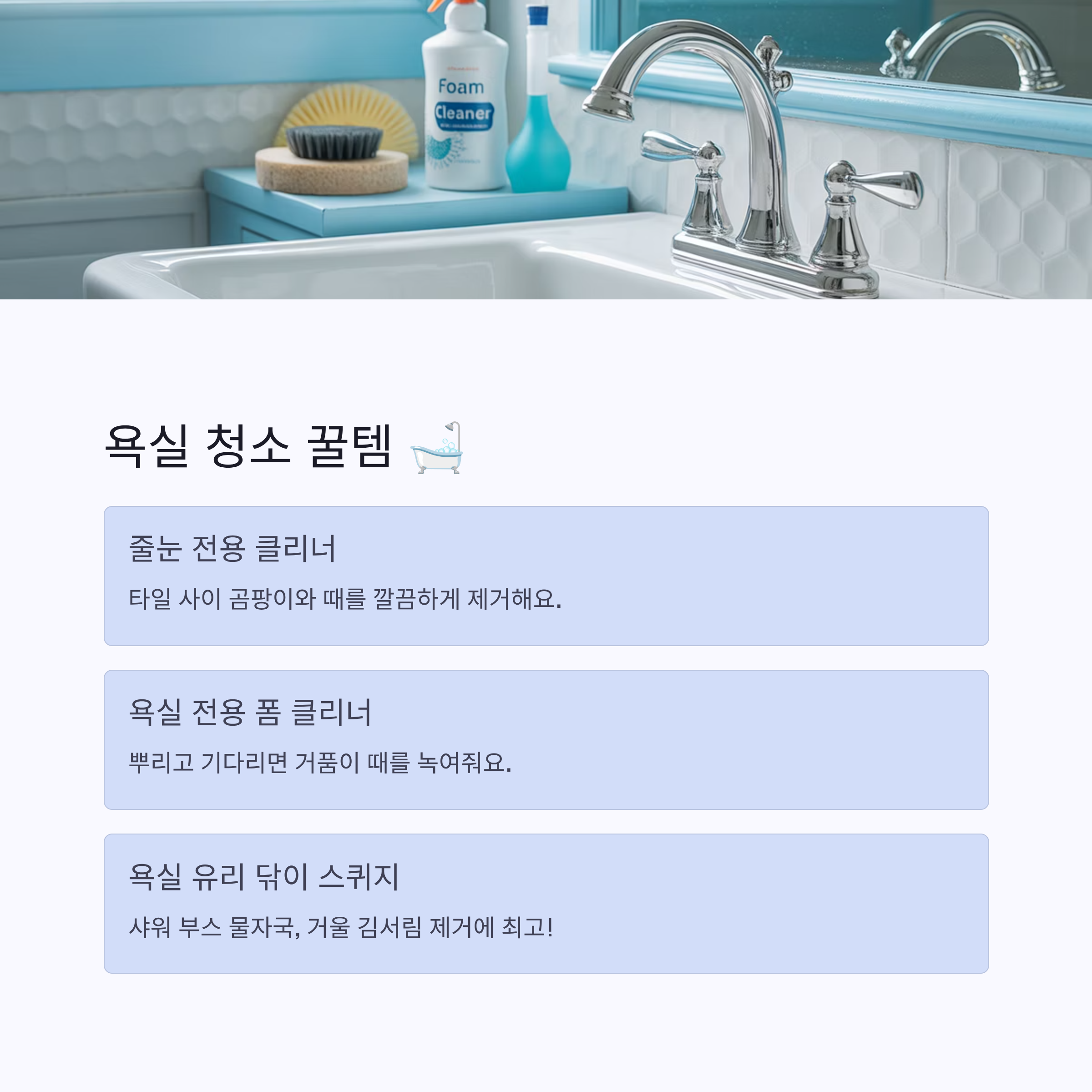물기 많고 곰팡이 걱정되는 욕실도 꿀템만 있으면 매일매일 쾌적하게 유지할 수 있어요 🛁 👉 다음은 🛋️ 거실·침실 청소템 섹션이 자동 출력됩니다!