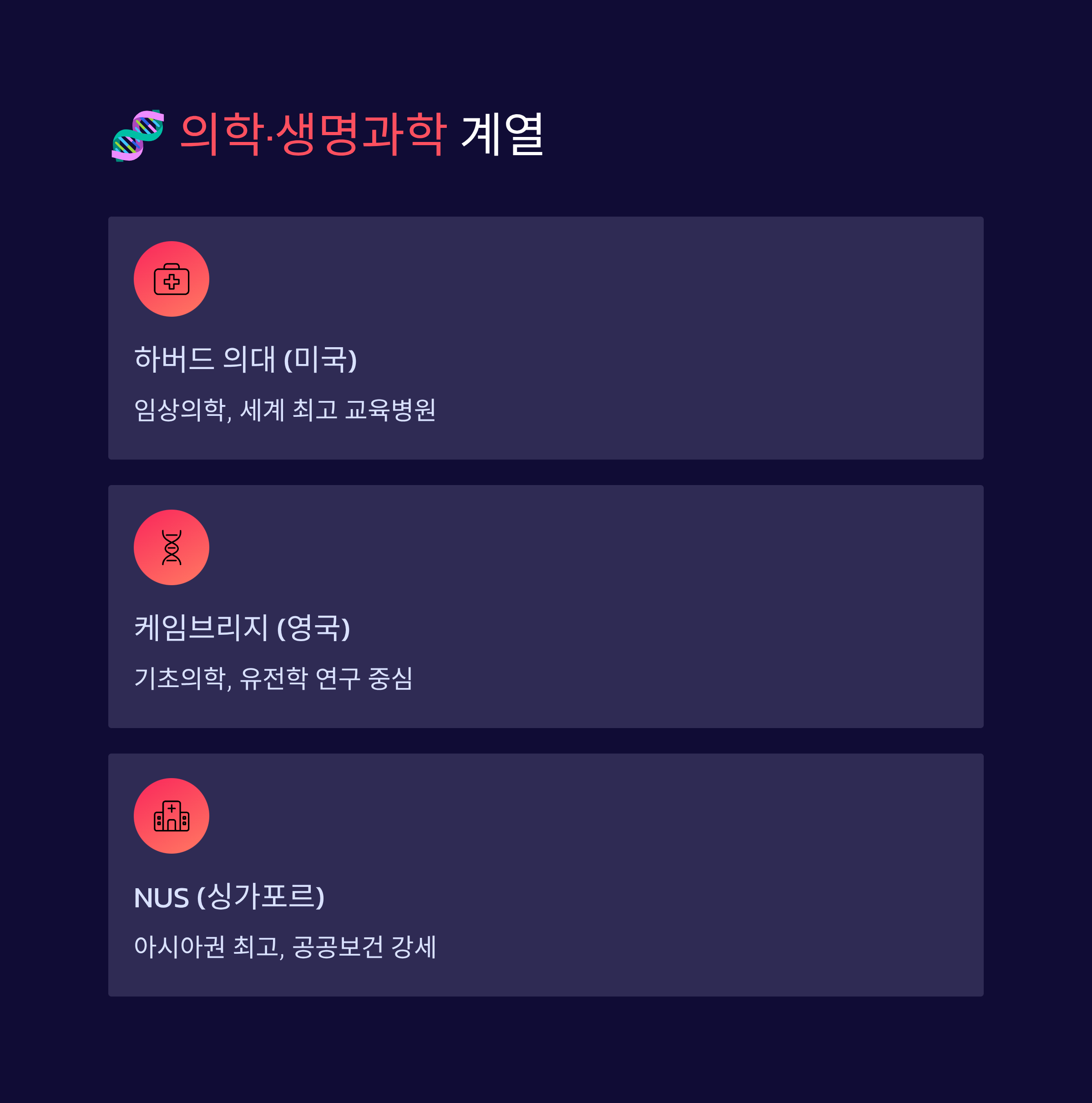 | 하버드 의대 | 미국 | 임상의학, 생명과학 | 세계 최고 수준 교육 병원 |