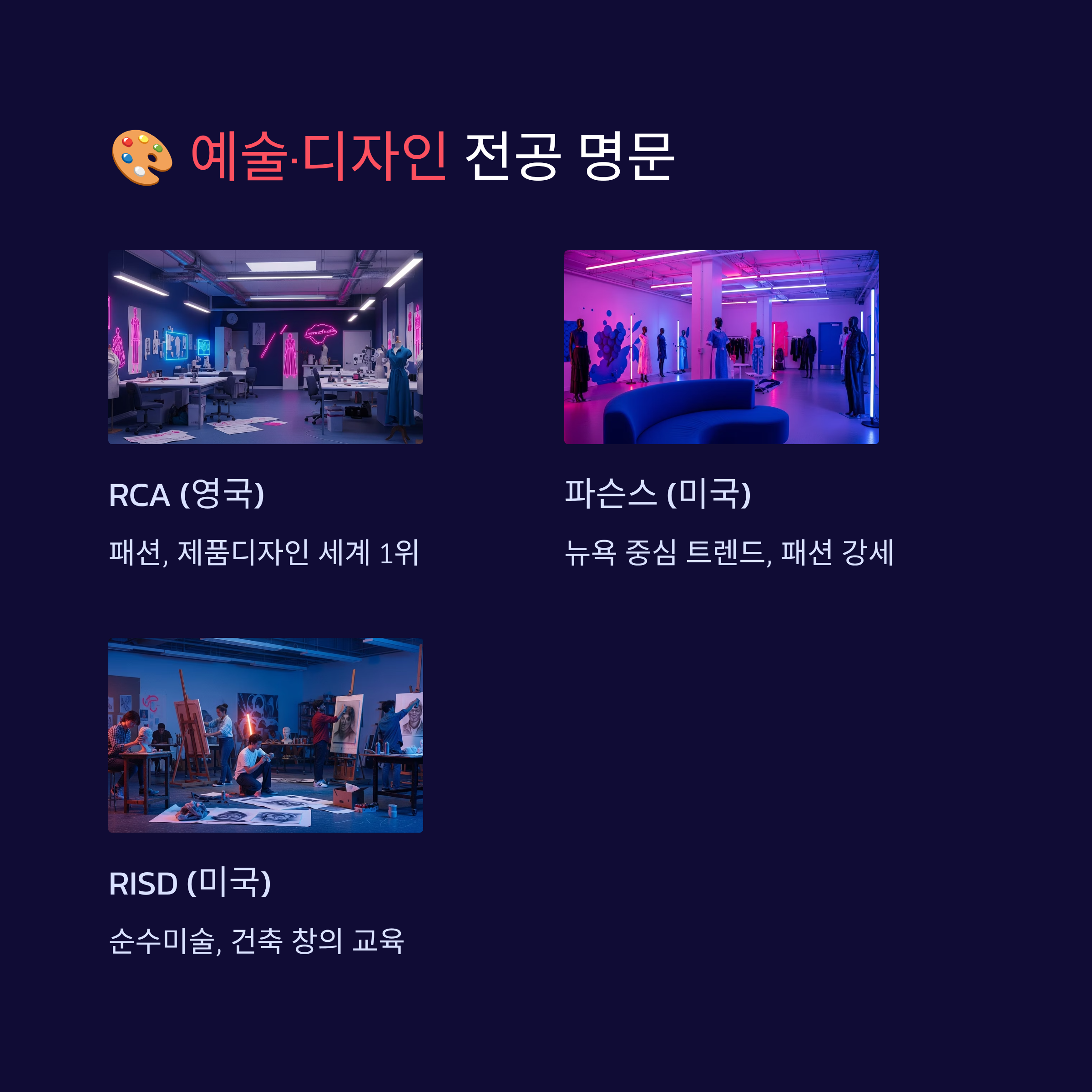 예술·디자인 분야는 실기와 창의성이 핵심이라 커리큘럼뿐만 아니라 교수진, 졸업생 포트폴리오, 업계 네트워크가 아주 중요해요. 학교의 명성만으로 결정하기보다는 실제 어떤 프로젝트와 환경이 제공되는지 확인해야 해요.