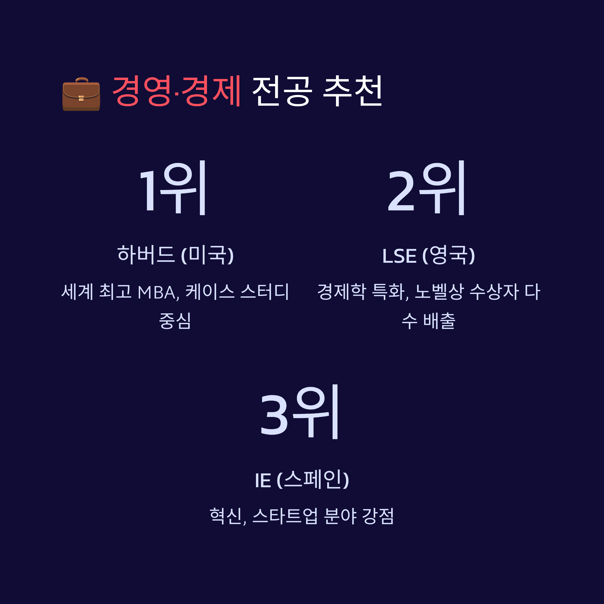 경영학과 경제학은 전 세계 어디서나 인기가 많은 전공이에요. 명문대일수록 글로벌 기업과의 파트너십, 실무 중심의 커리큘럼, 창업 교육이 잘 되어 있는 것이 특징이에요.