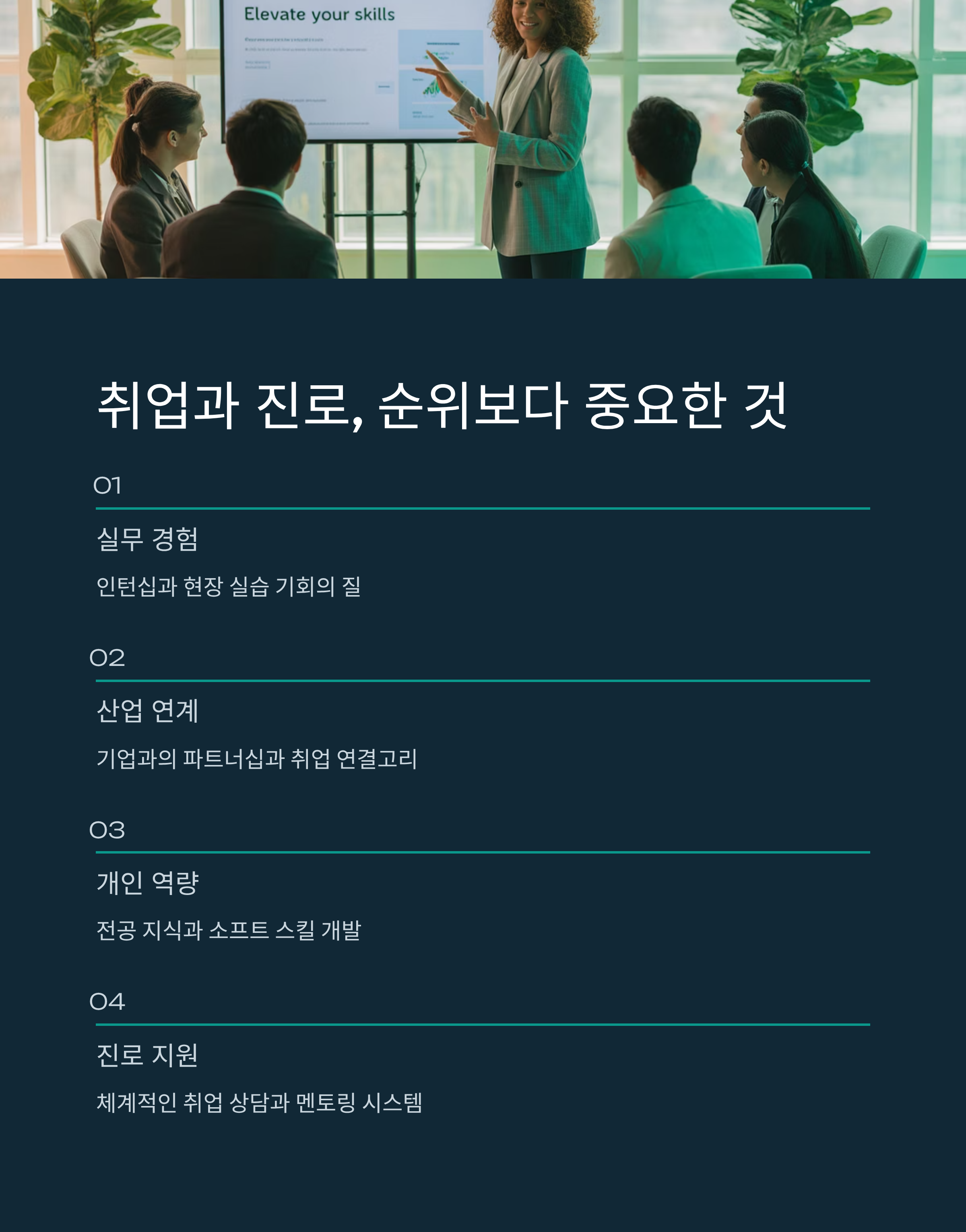 A1. 꼭 그렇진 않아요! 요즘은 실무 경험, 인턴십, 포트폴리오가 더 중요하게 작용해요. 실제로 취업률이 높은 대학들 중엔 순위가 낮은 곳도 많아요.
