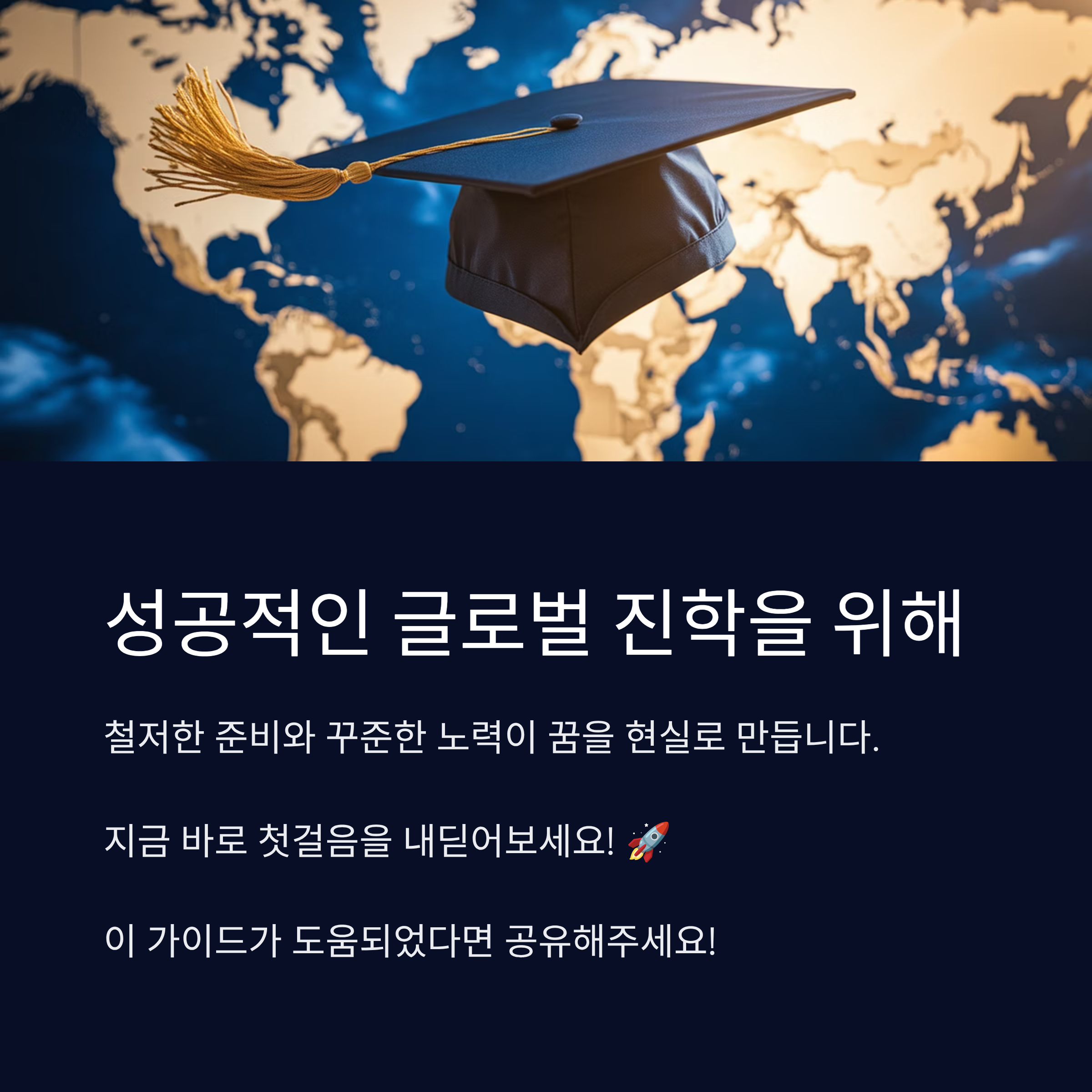 해외 대학 진학은 생각보다 준비할 것이 많지만, 차근차근 준비하면 누구든지 도전할 수 있어요. 오늘 시작한 이 가이드가 여러분의 유학 여정을 더욱 명확하게 해줄 거예요. 🚀