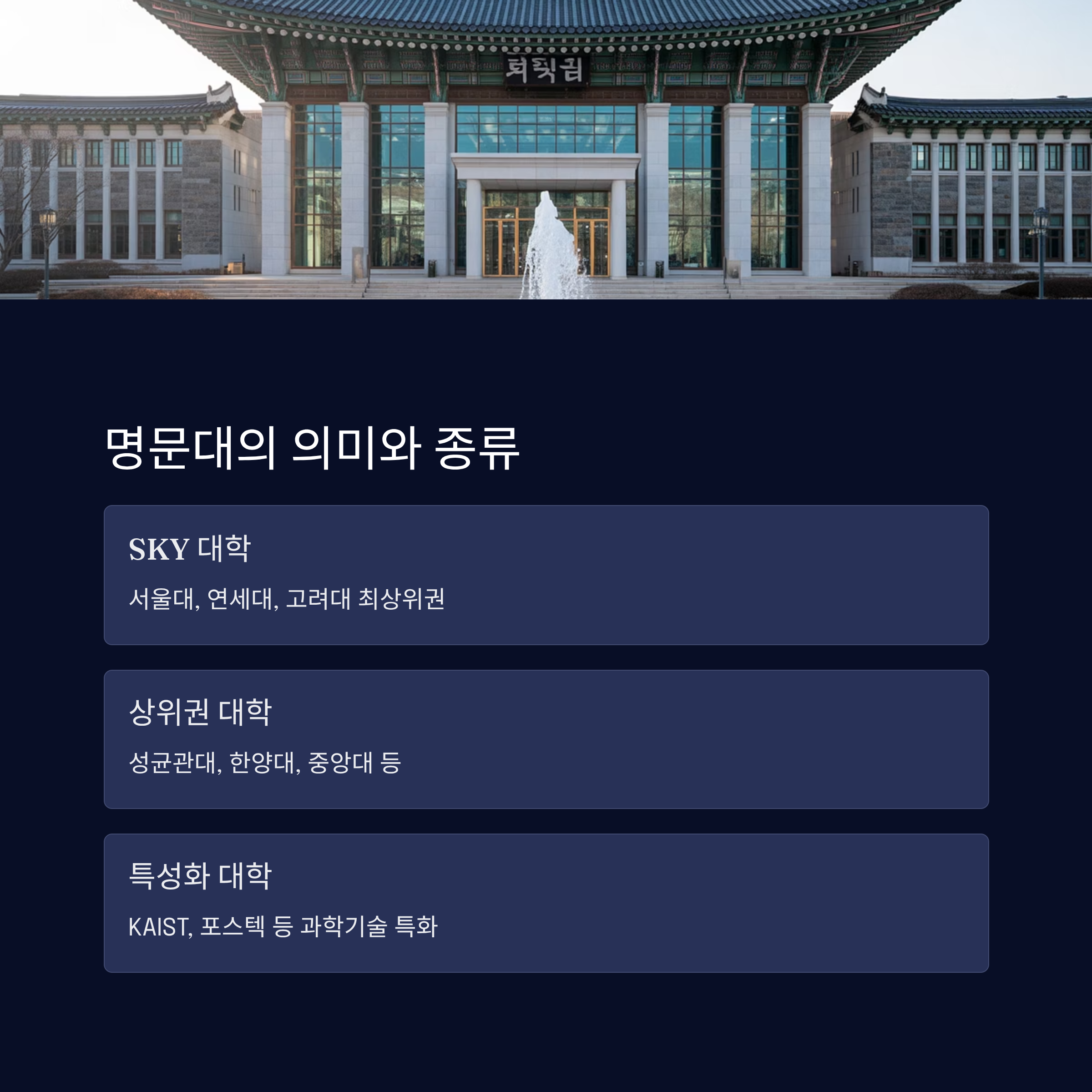 "명문대"라는 단어는 사람마다 다르게 정의할 수 있어요. 보통은 SKY(서울대, 고려대, 연세대)를 중심으로 KAIST, POSTECH, UNIST, 그리고 이화여대나 성균관대 같은 최상위권 대학까지 포함되죠.