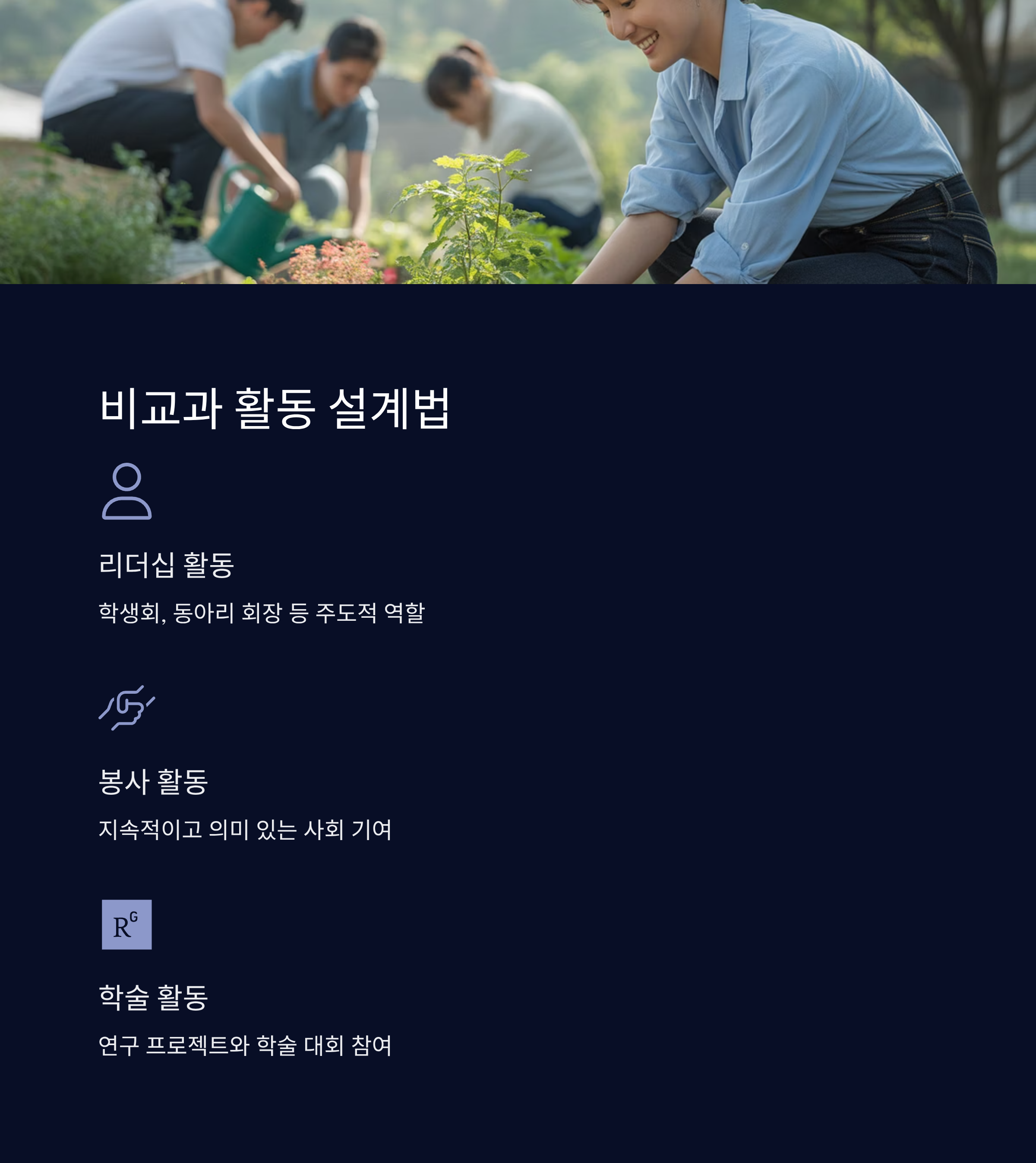 비교과 활동은 학종 전형의 핵심 요소예요. 단순히 봉사시간을 채우는 게 아니라, 진로와 연계된 의미 있는 활동을 설계하는 게 중요해요. 활동 하나하나가 나를 설명해주는 스토리 조각이 되니까요.